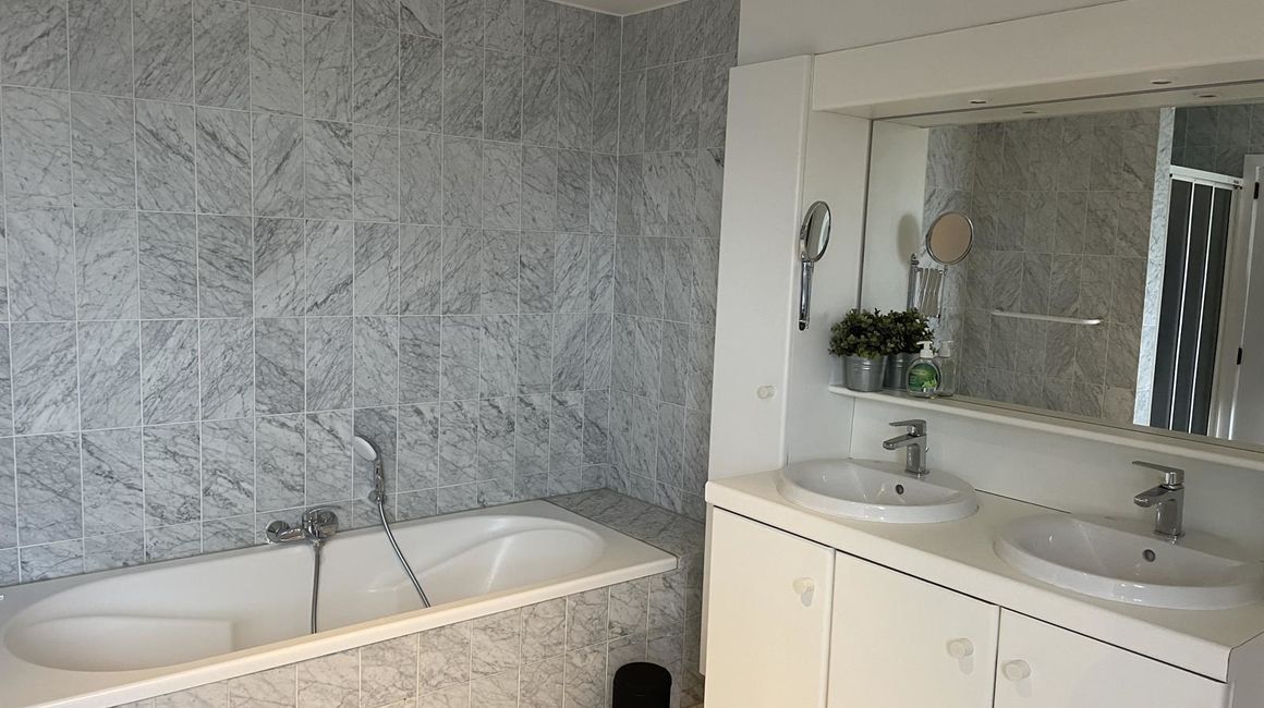 Hoofdslaapkamer met ingemaakte kasten en ensuite een ingerichte badkamer (bad, douche, toilet, 2 lavabo’s),