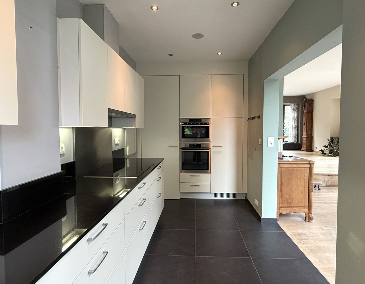 De modern ingerichte KEUKEN ca. 5,60m x 2,10m sluit rechtstreeks aan bij de leefruimte en is uitgerust met een granieten werkblad en kwalitatieve SIEMENS-toestellen. Vanuit de keuken is er directe toegang tot het zonnige terras en de groene tuin, ideaal om te genieten op een zonnige dag.