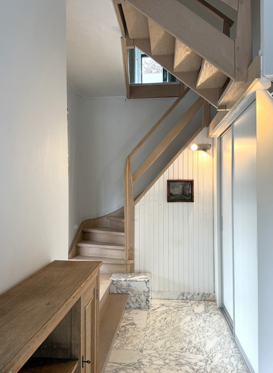 Bij het betreden van de woning valt meteen de stijlvolle inkomhal op, afgewerkt met een elegante witmarmeren vloer voorzien van een gastentoilet en vestiaire. De ruime, lichtrijke LEEFRUIMTE baadt in natuurlijk licht dankzij de grote raampartijen en is afgewerkt met een warme parketvloer. De living, salon en eetkamer vormen samen een harmonieus geheel en beschikken over een praktische vaste kastenwand.