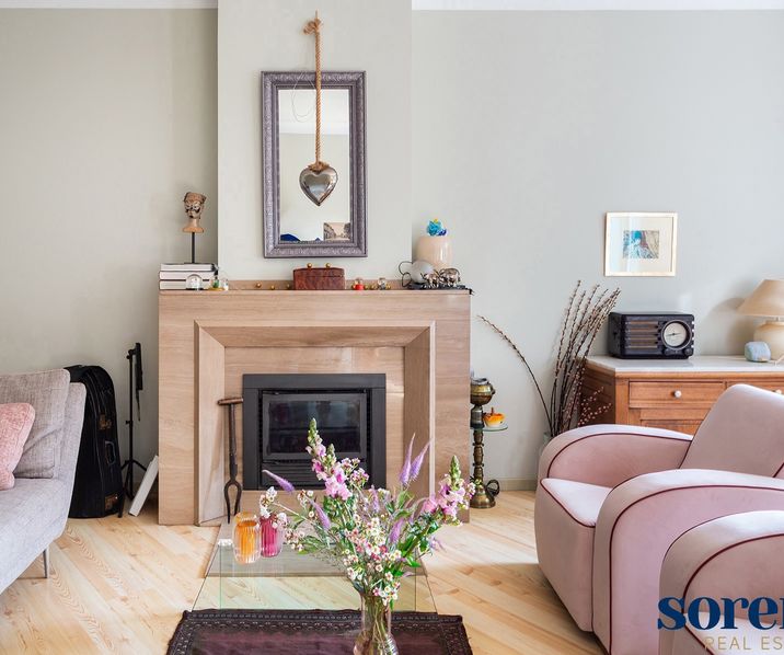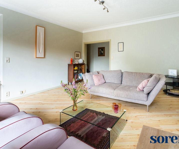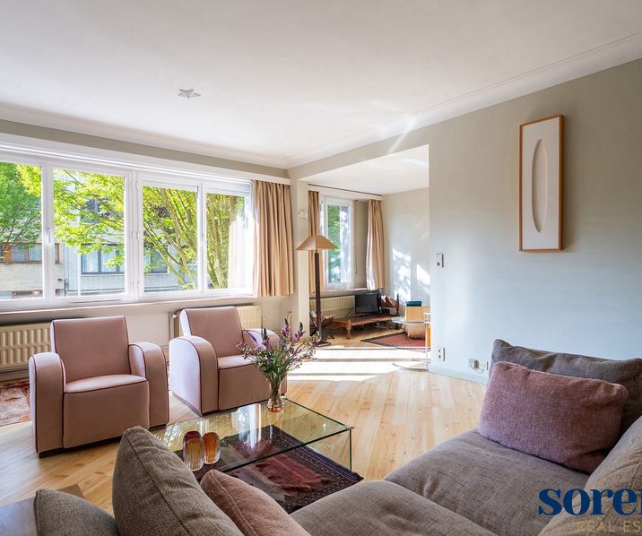 Via de hal met ingemaakte kasten bereikt u de lichtrijke L-vormige LEEFRUIMTE, met grote raampartijen die zorgen voor veel natuurlijk licht.