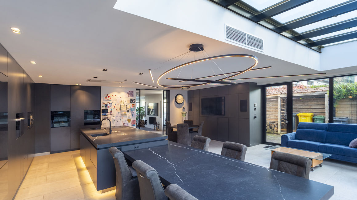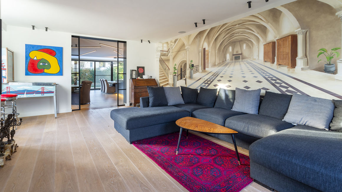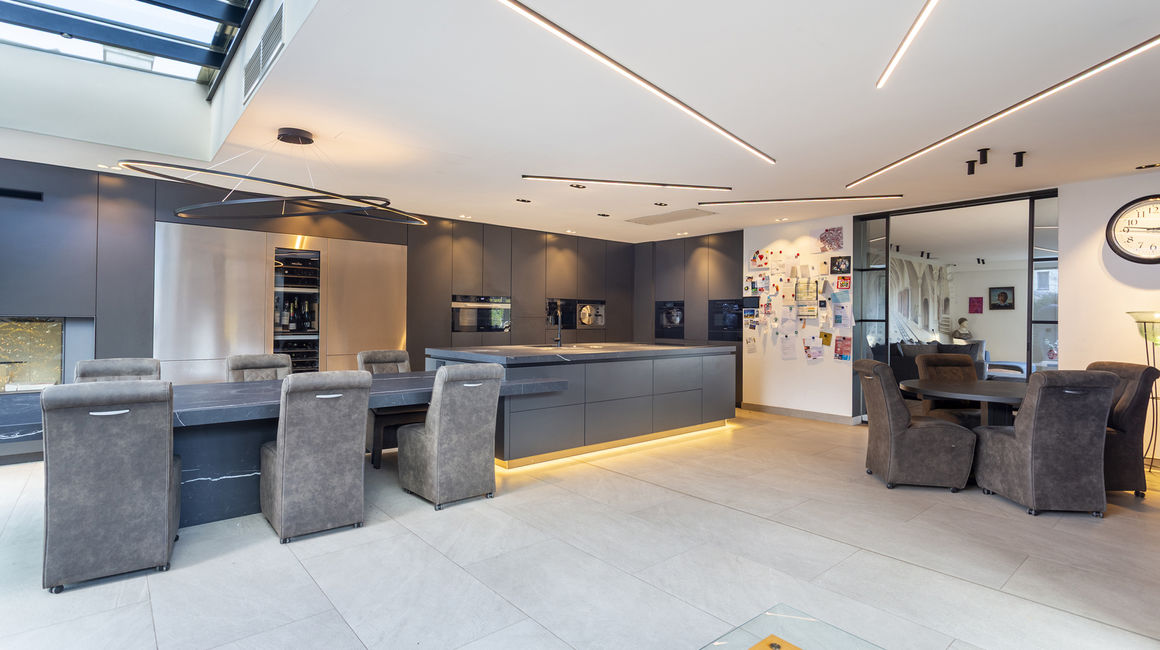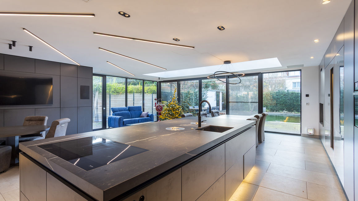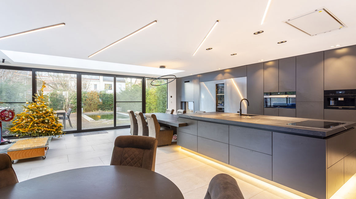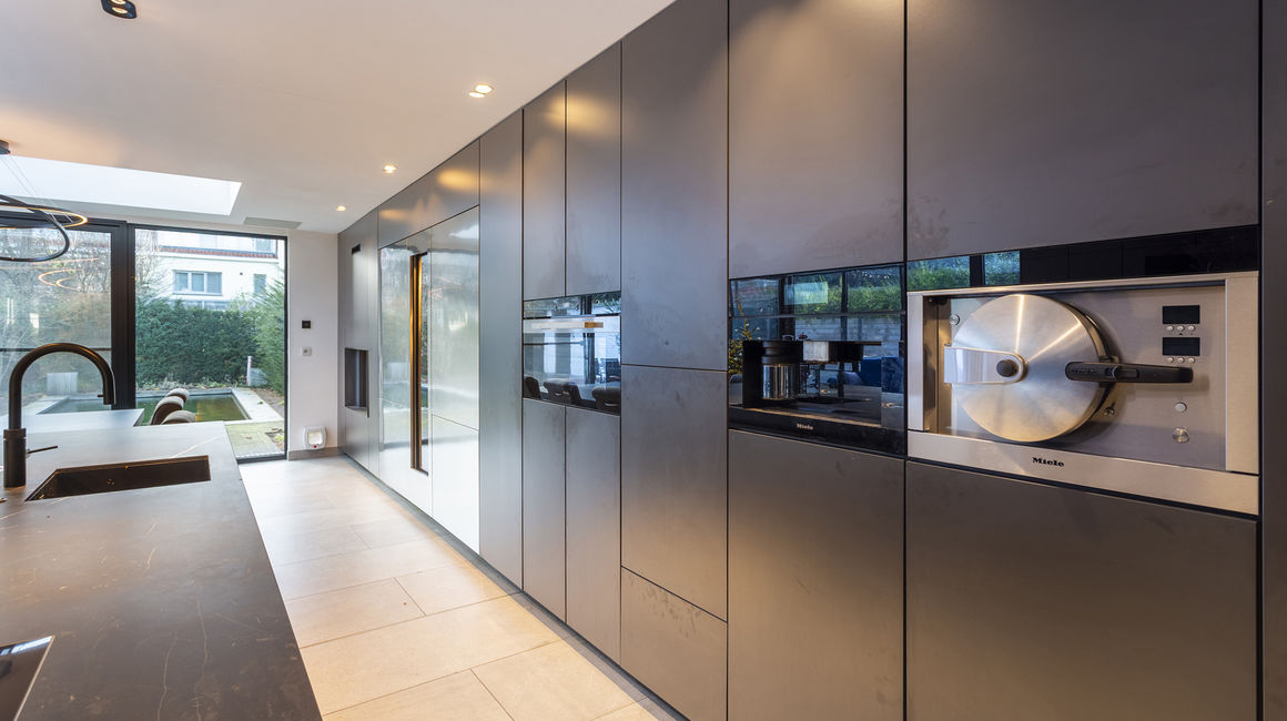 U betreedt de woning via een ruime INKOMHAL van ca. 19m², voorzien van schoen- en kledingkast met een apart toilet en handenwasser. Vervolgens komt u in de ruime LIVING van ca. 40m² op parketvloer. Via een glazen schuifdeur komt u komt u in de hypermoderne LEEFKEUKEN van ca. 65m² is maatwerk en uitgerust met een ontbijthoek, tal van opbergkasten en Miele toestellen: Keramieken werkblad, 2 ijskasten en vriezers met wijnkoeler, oven, ingebouwd koffiemachine, stoomoven, vaatwasser, combi-oven, microgolf, bordverwarmer, vacumeerlade, inductie kookplaat met dampkap en een ingebouwde spoelbak. Living en keuken zijn beiden tevens uitgerust met domotica en beschikken over een open haard.