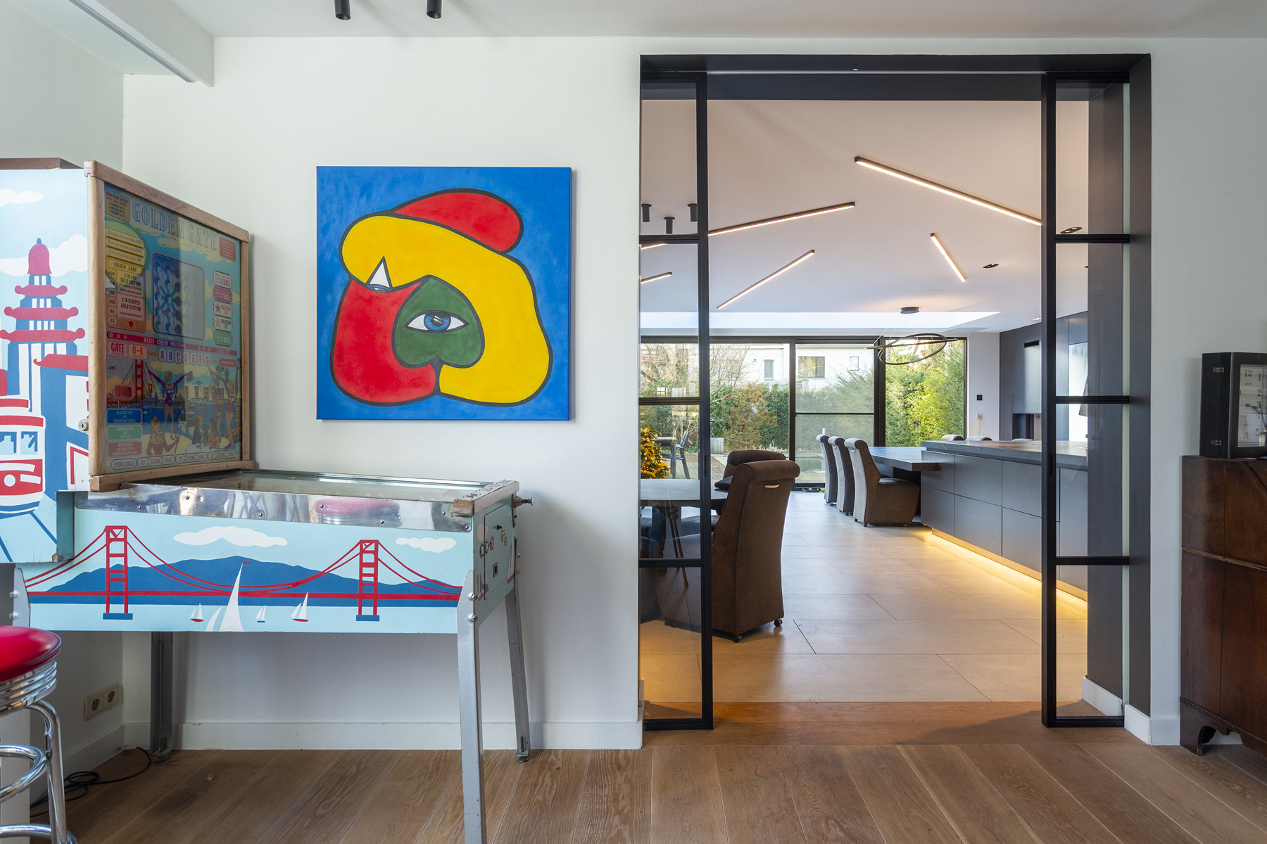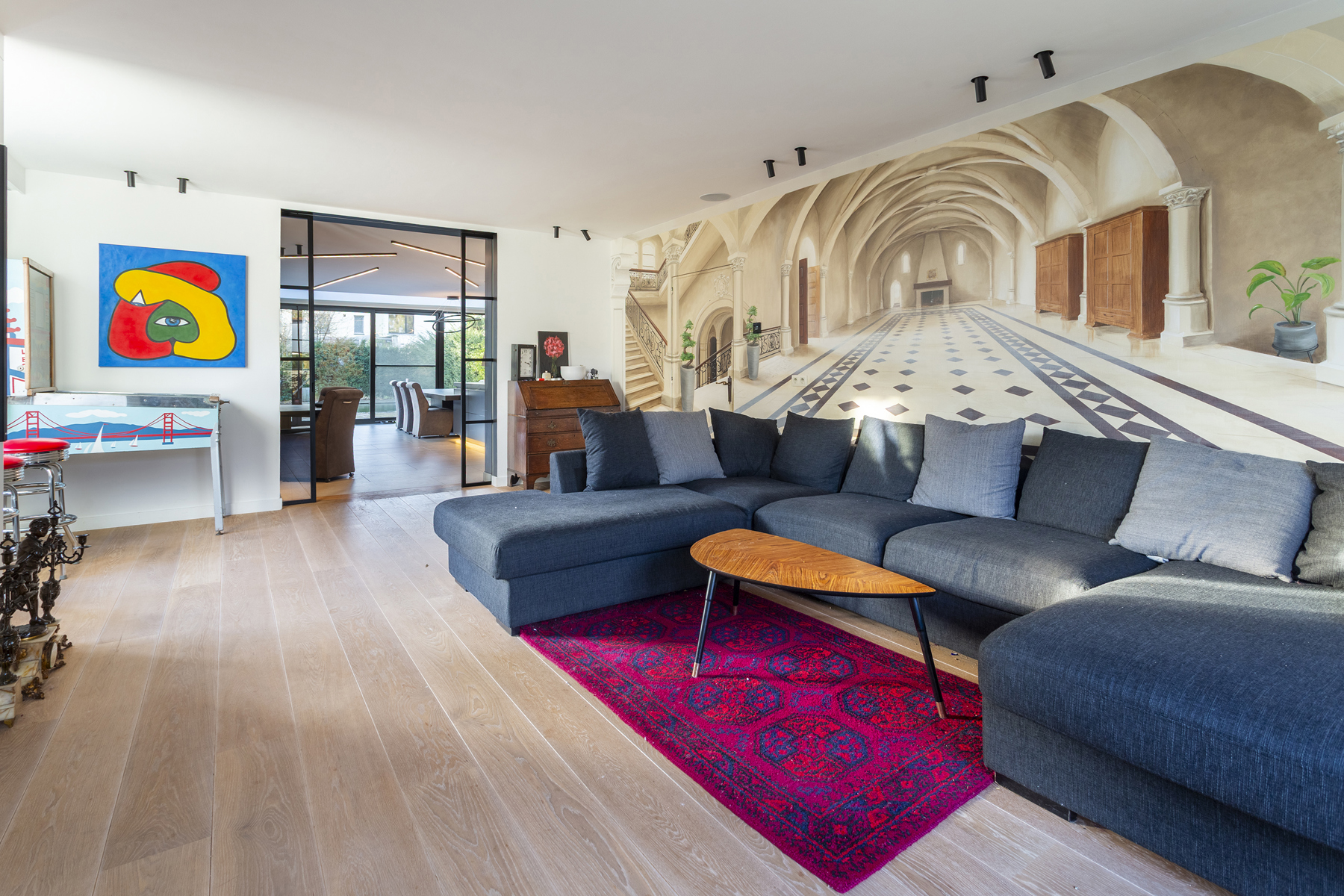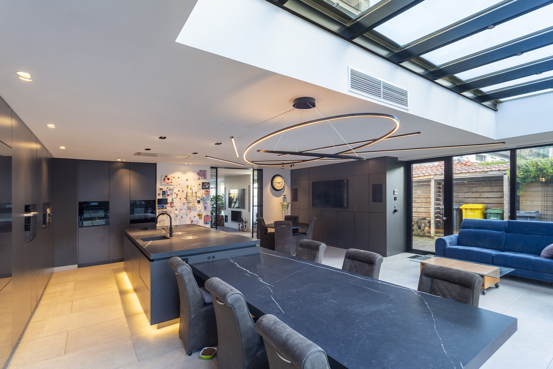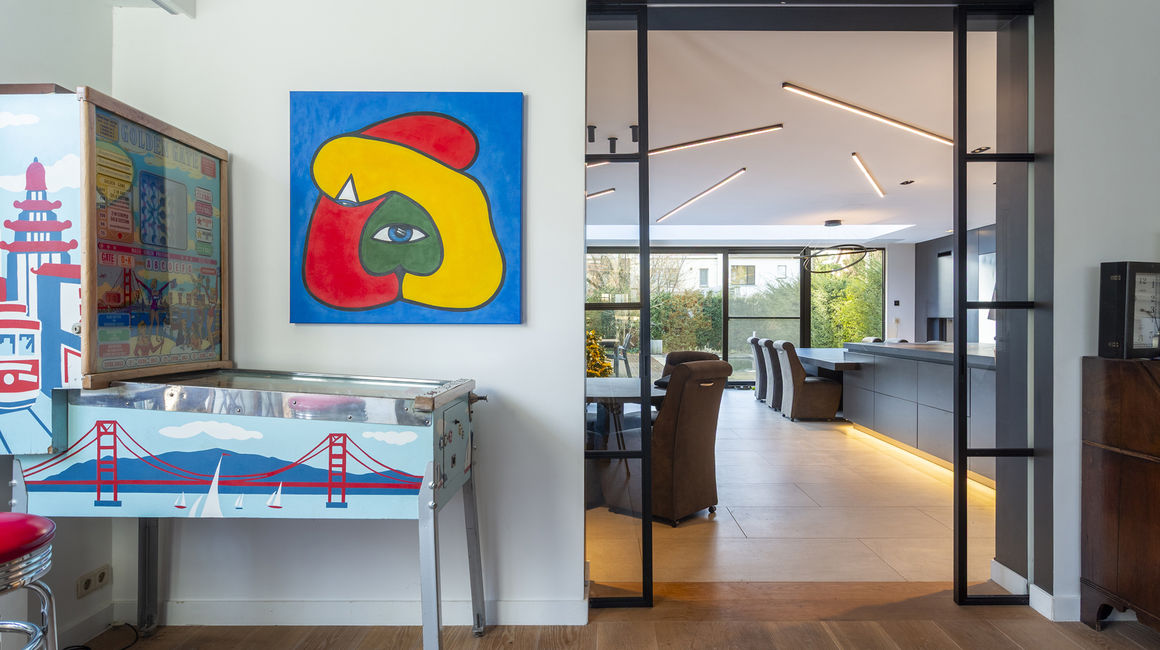 U betreedt de woning via een ruime INKOMHAL van ca. 19m², voorzien van schoen- en kledingkast met een apart toilet en handenwasser. Vervolgens komt u in de ruime LIVING van ca. 40m² op parketvloer. Via een glazen schuifdeur komt u komt u in de hypermoderne LEEFKEUKEN van ca. 65m² is maatwerk en uitgerust met een ontbijthoek, tal van opbergkasten en Miele toestellen: Keramieken werkblad, 2 ijskasten en vriezers met wijnkoeler, oven, ingebouwd koffiemachine, stoomoven, vaatwasser, combi-oven, microgolf, bordverwarmer, vacumeerlade, inductie kookplaat met dampkap en een ingebouwde spoelbak. Living en keuken zijn beiden tevens uitgerust met domotica en beschikken over een open haard.