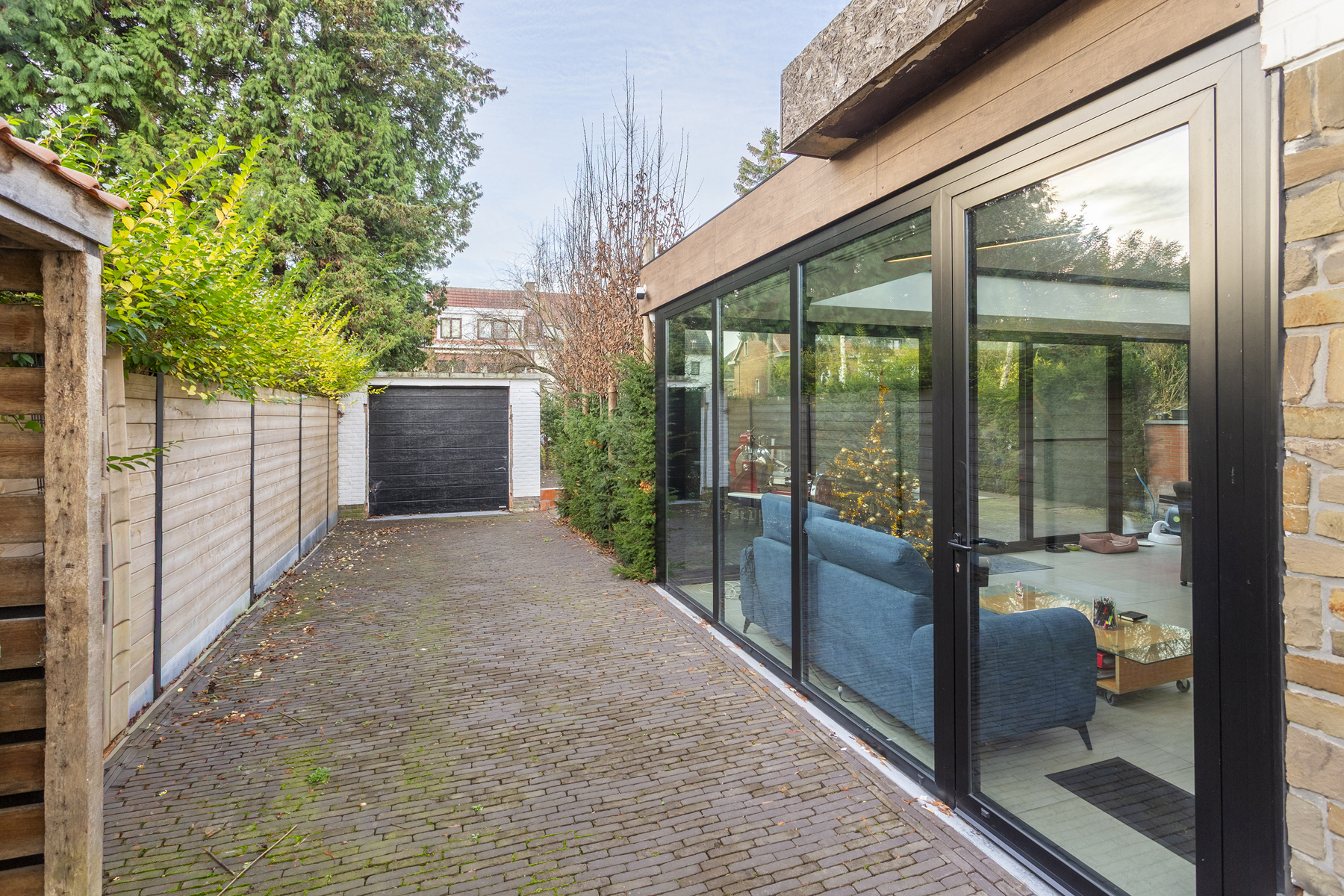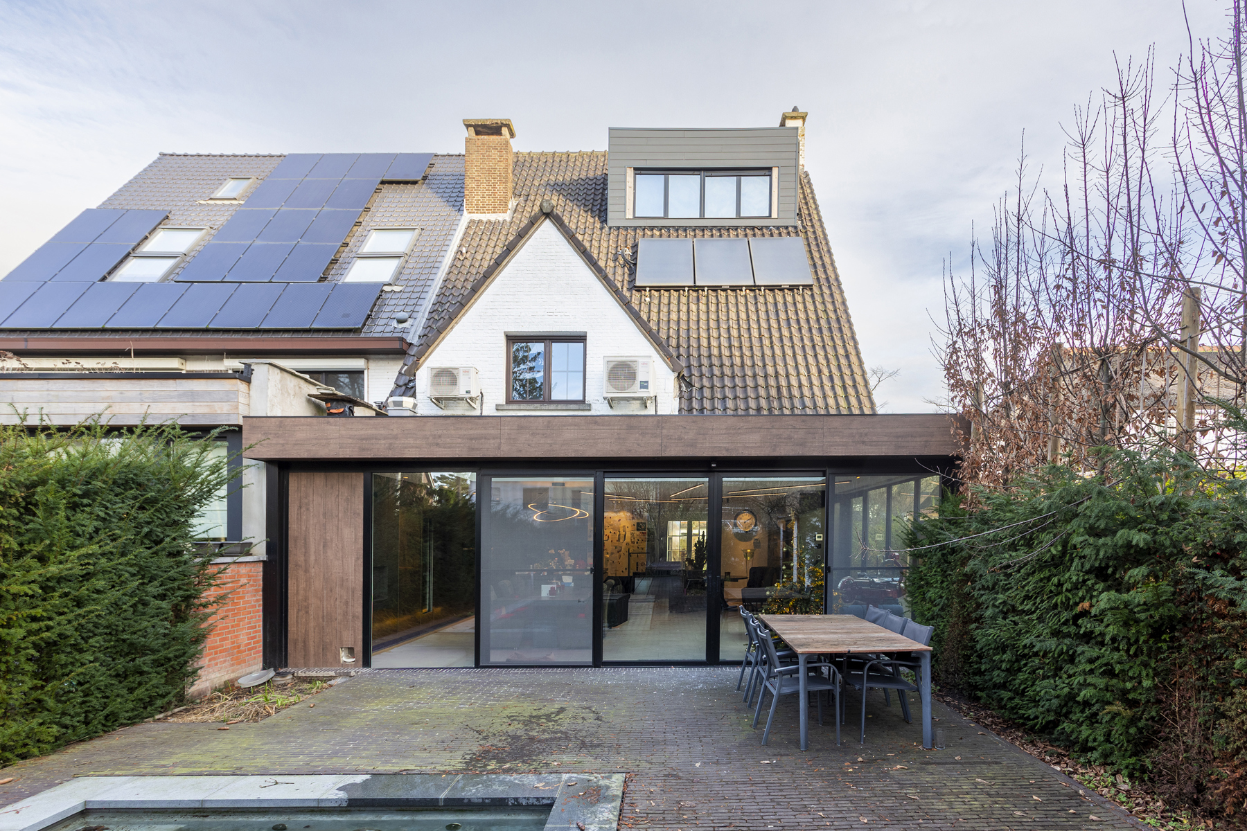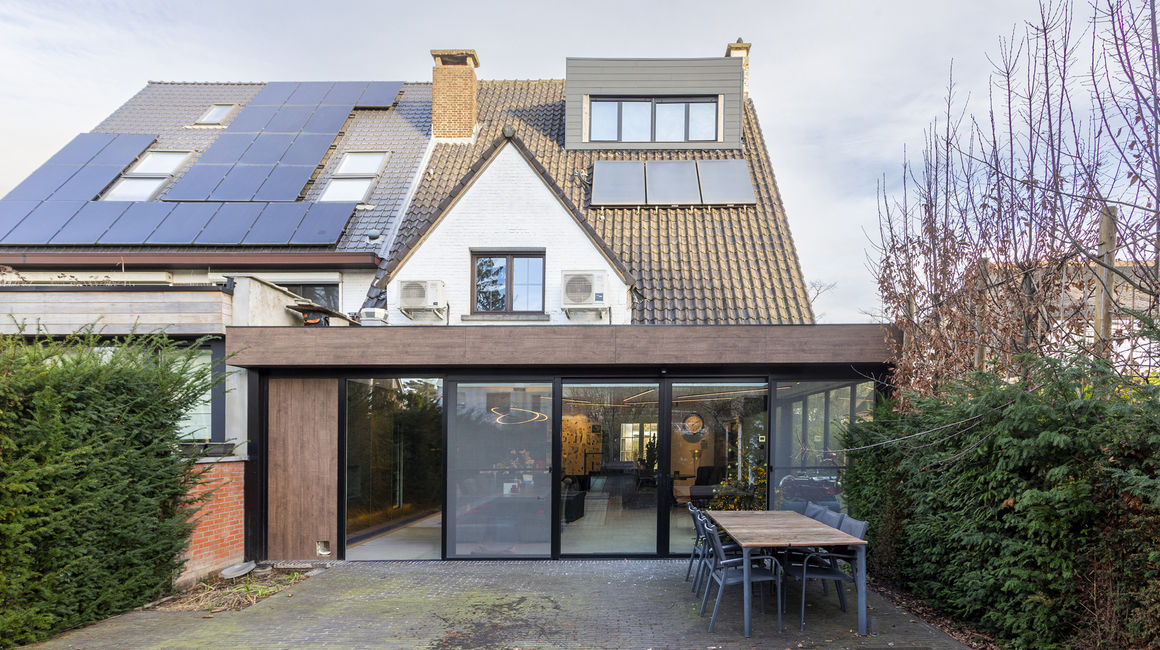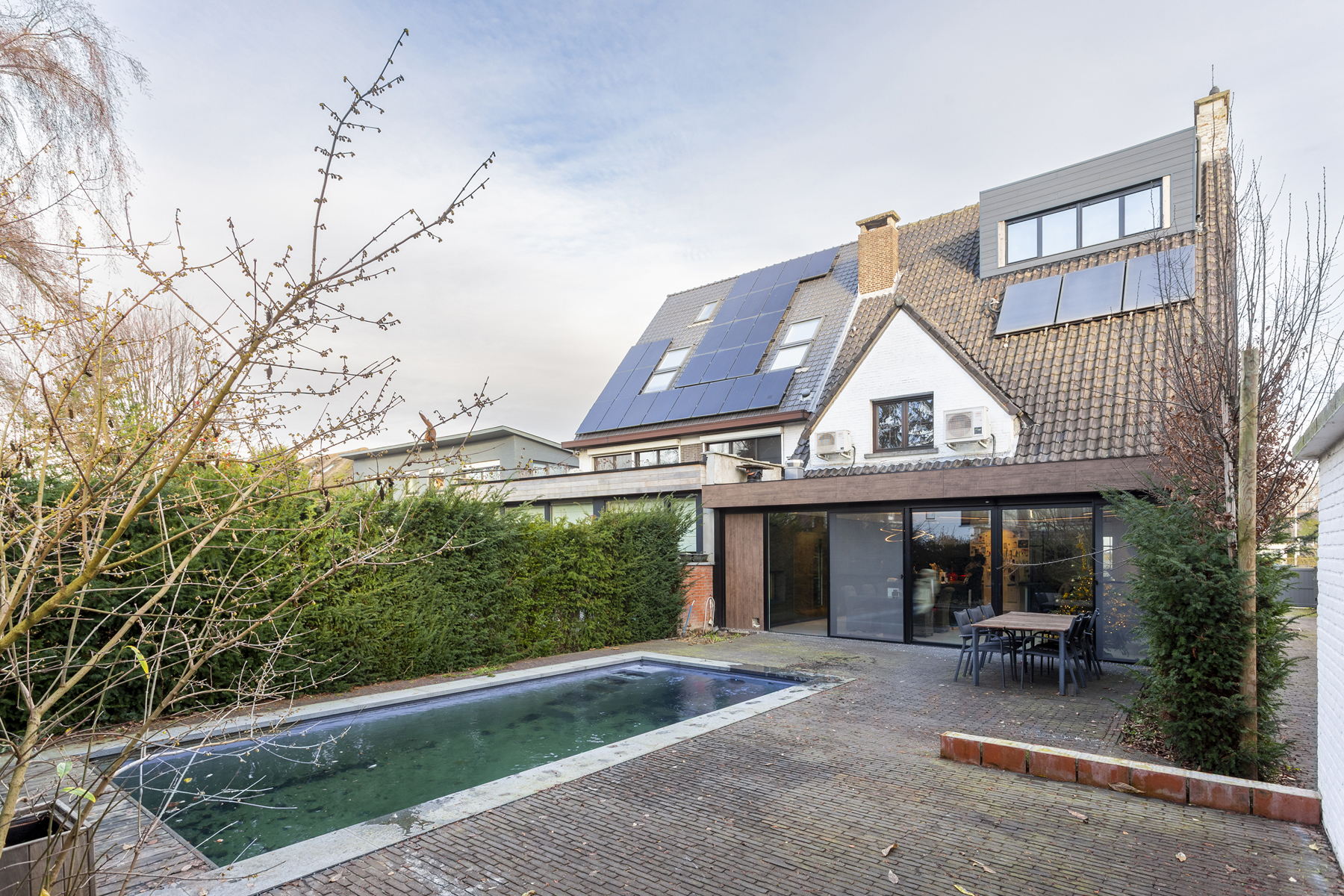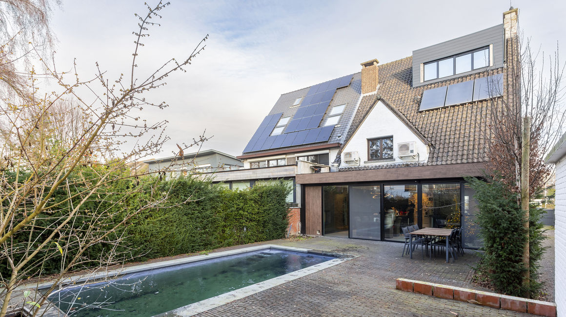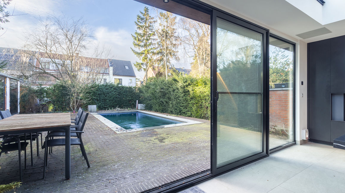 Langs de schuiframen komt u terecht in de tuin / terras voorzien van een zwembad met jetstream, verlichting en automatische zwembadcover.