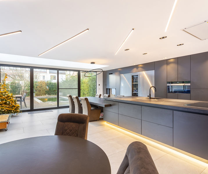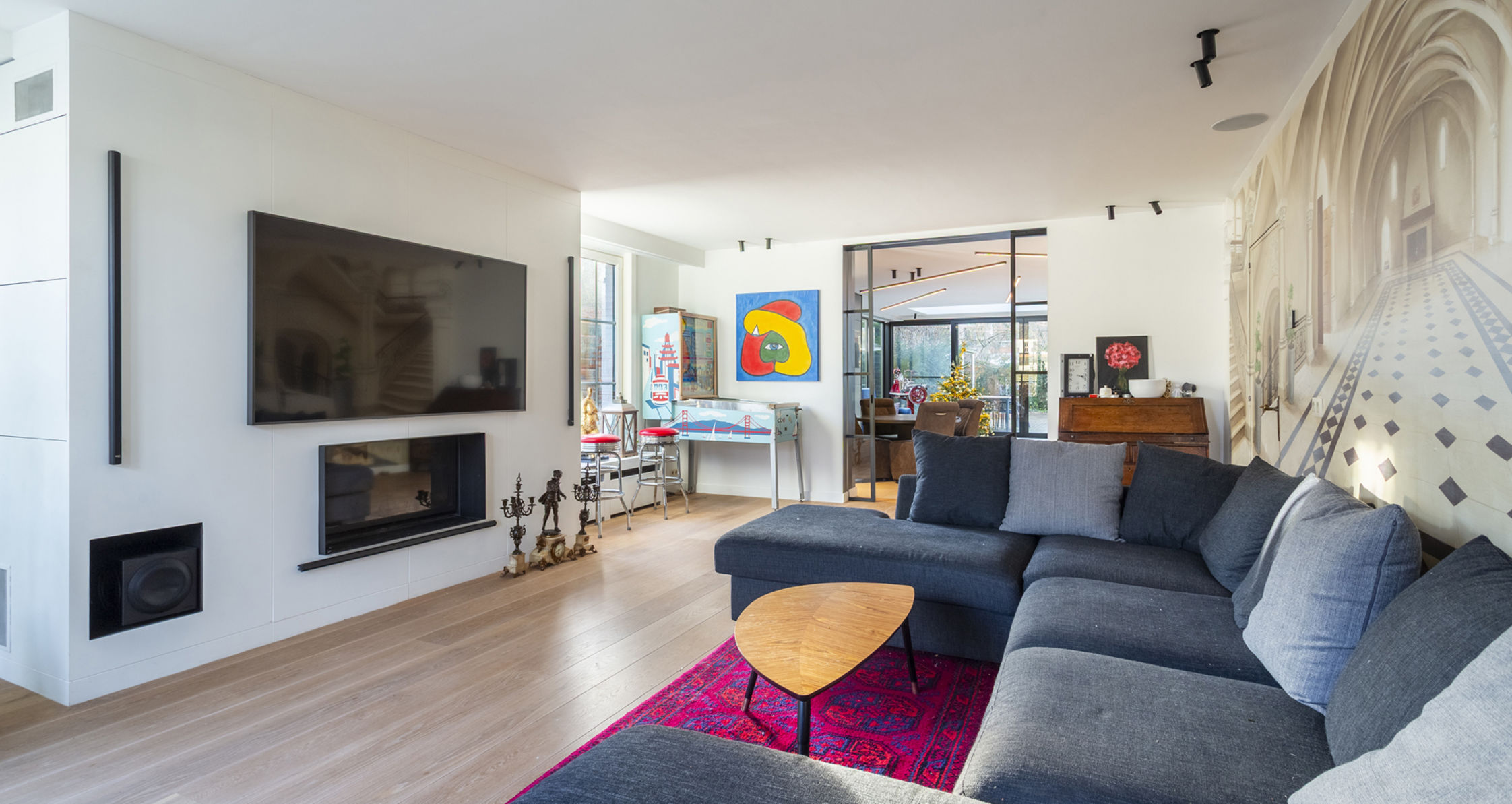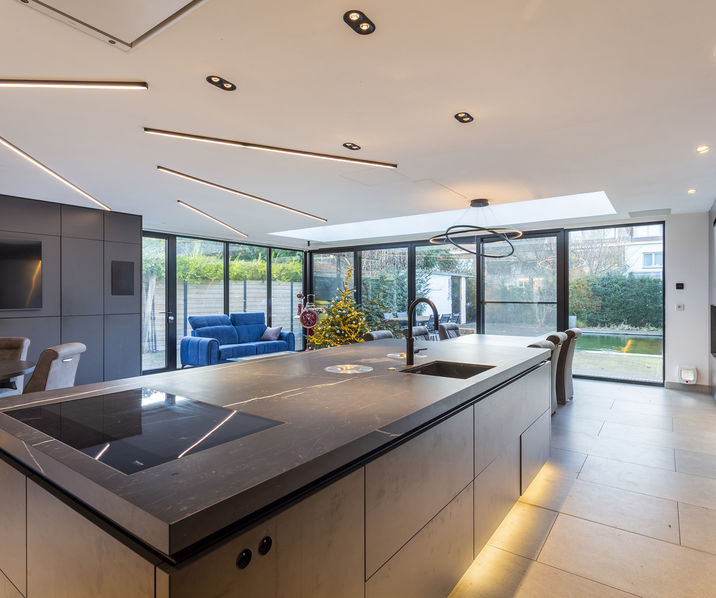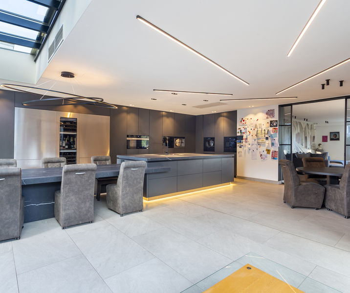 U betreedt de woning via een ruime INKOMHAL van ca. 19m², voorzien van schoen- en kledingkast met een apart toilet en handenwasser. Vervolgens komt u in de ruime LIVING van ca. 40m² op parketvloer. Via een glazen schuifdeur komt u komt u in de hypermoderne LEEFKEUKEN van ca. 65m² is maatwerk en uitgerust met een ontbijthoek, tal van opbergkasten en Miele toestellen: Keramieken werkblad, 2 ijskasten en vriezers met wijnkoeler, oven, ingebouwd koffiemachine, stoomoven, vaatwasser, combi-oven, microgolf, bordverwarmer, vacumeerlade, inductie kookplaat met dampkap en een ingebouwde spoelbak. Living en keuken zijn beiden tevens uitgerust met domotica en beschikken over een open haard.
