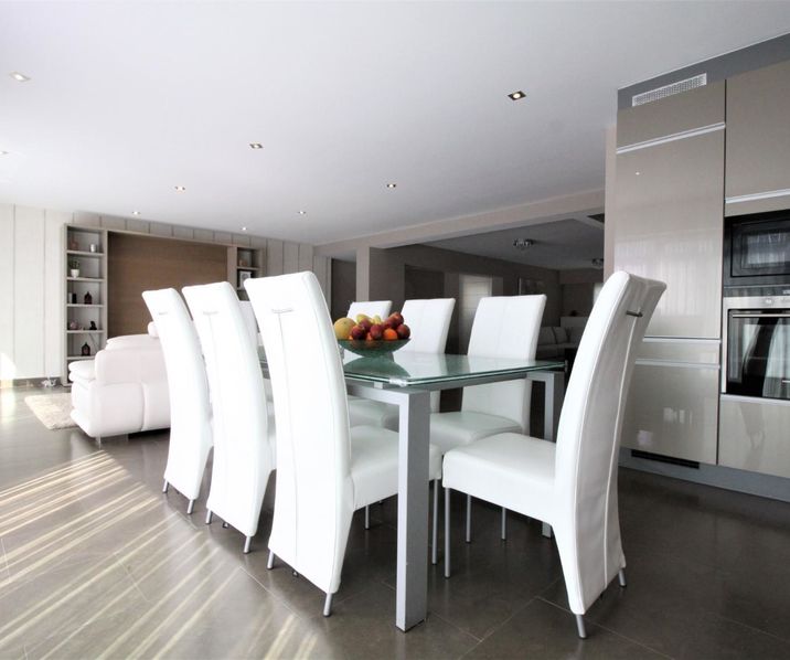 De open geïnstalleerde KEUKEN is voorzien van tal van opbergkasten en alle nodige toestellen; oven, microgolf-oven, vaatwasser, koelkast, vriezer en kookvuur op gas met dampkap.