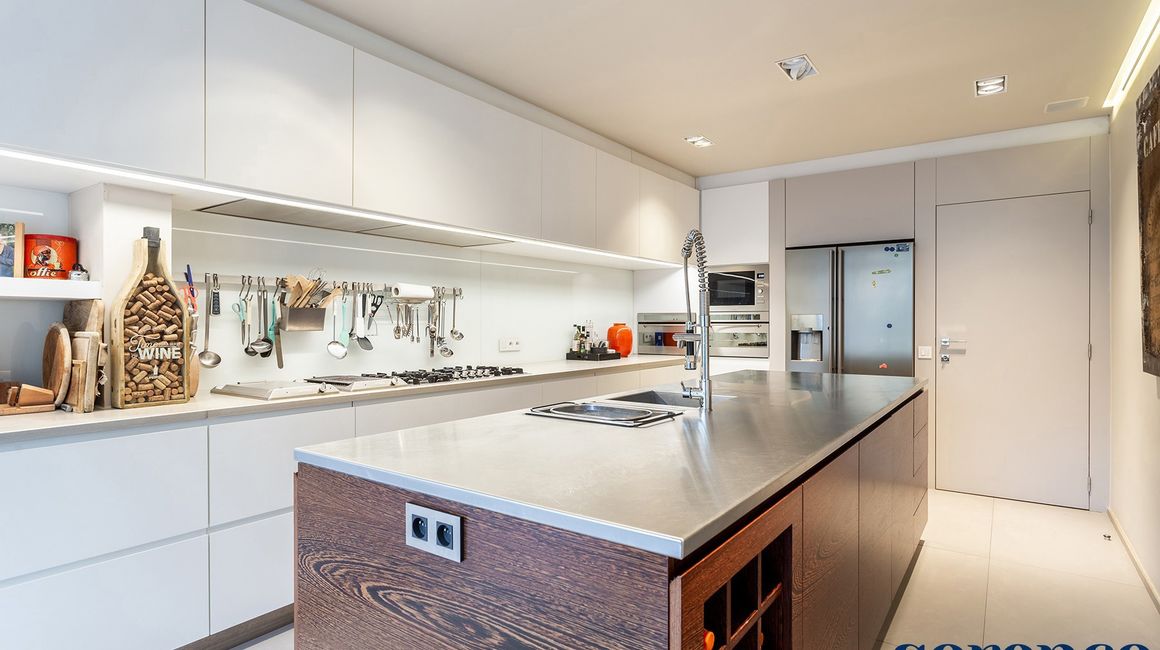 De moderne keuken is volledig uitgerust met hoogwaardige Smeg-toestellen, waaronder een 5-pits gasfornuis, grill, friteuse, oven, stoomoven, microgolfoven, vaatwasser, koelkast en diepvries. Het kookeiland met inox werkblad, de vele opbergmogelijkheden en een gezellige ontbijthoek maken van deze keuken een echte blikvanger.