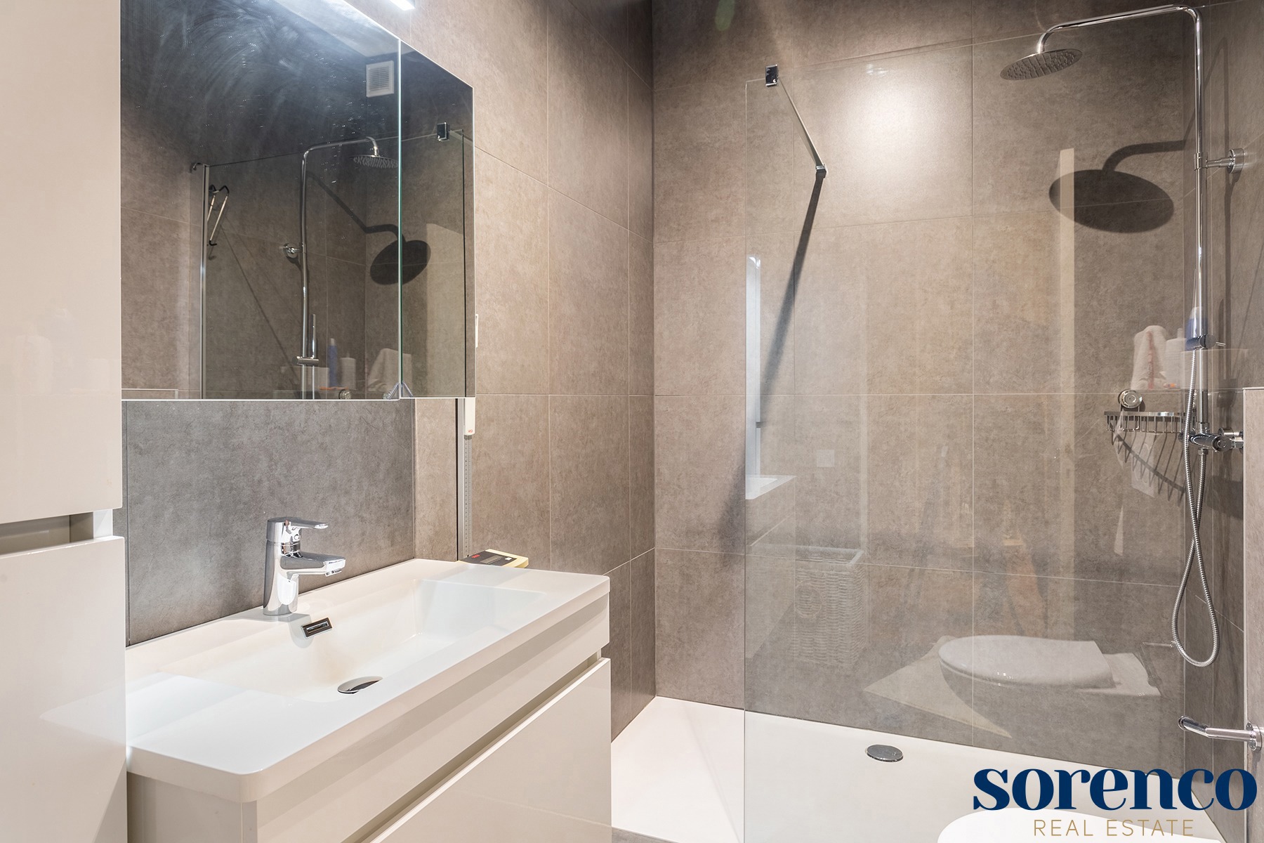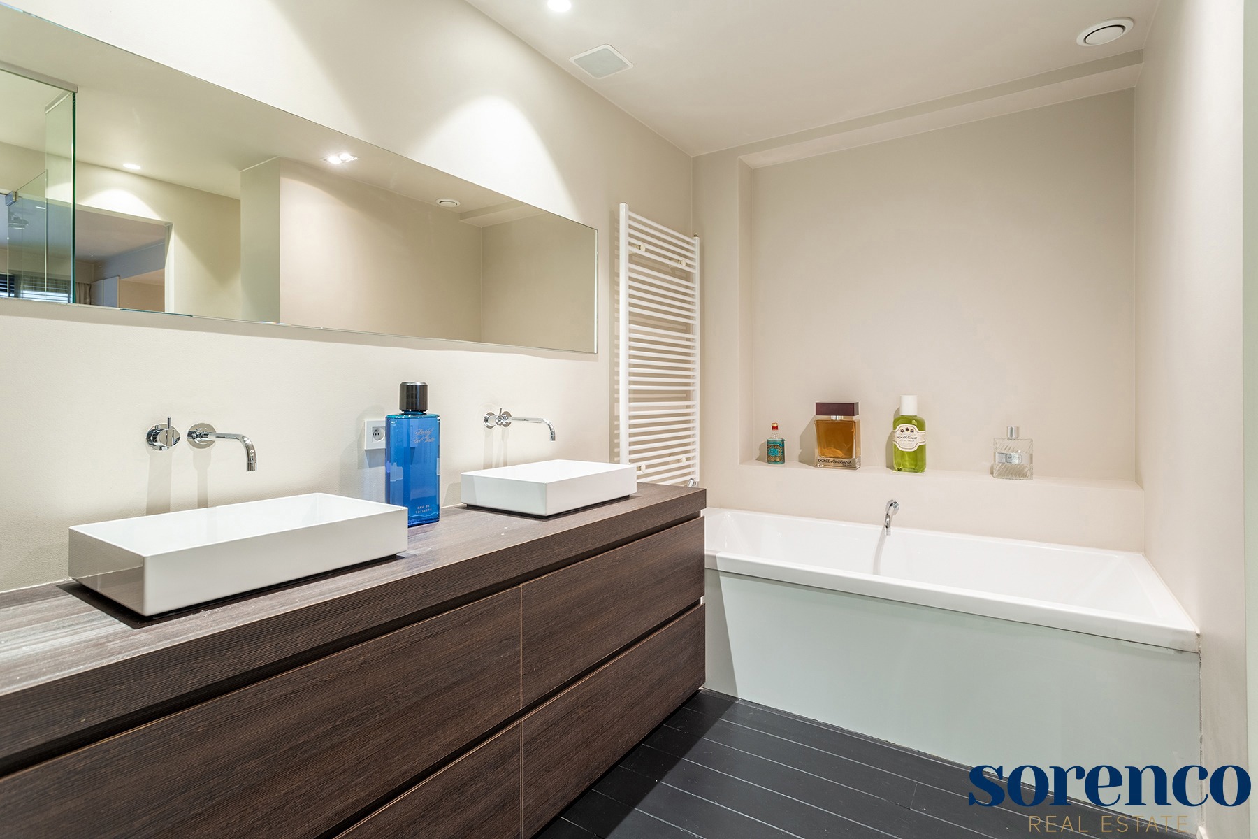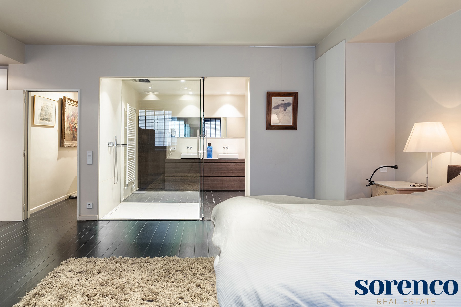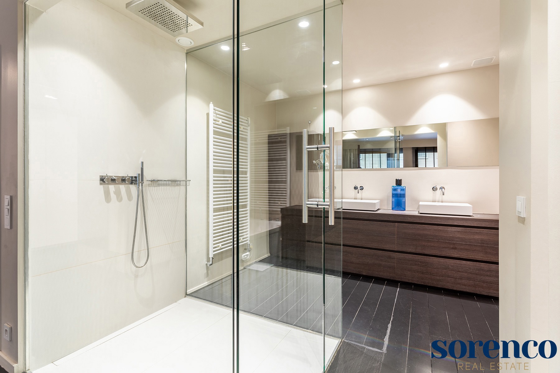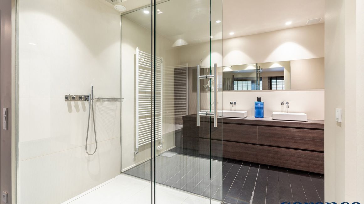 Via de nachthal, eveneens voorzien van parket, bereikt u het slaapgedeelte. De royale masterbedroom is uitgerust met een ensuite walk-in dressing en een luxueuze badkamer met een inloop regendouche, ligbad, handdoekdroger en een dubbele wastafel in een stijlvol meubel. Daarnaast zijn er nog twee ruime slaapkamers op parket en een tweede badkamer met een inloop regendouche, wastafel en een toilet.