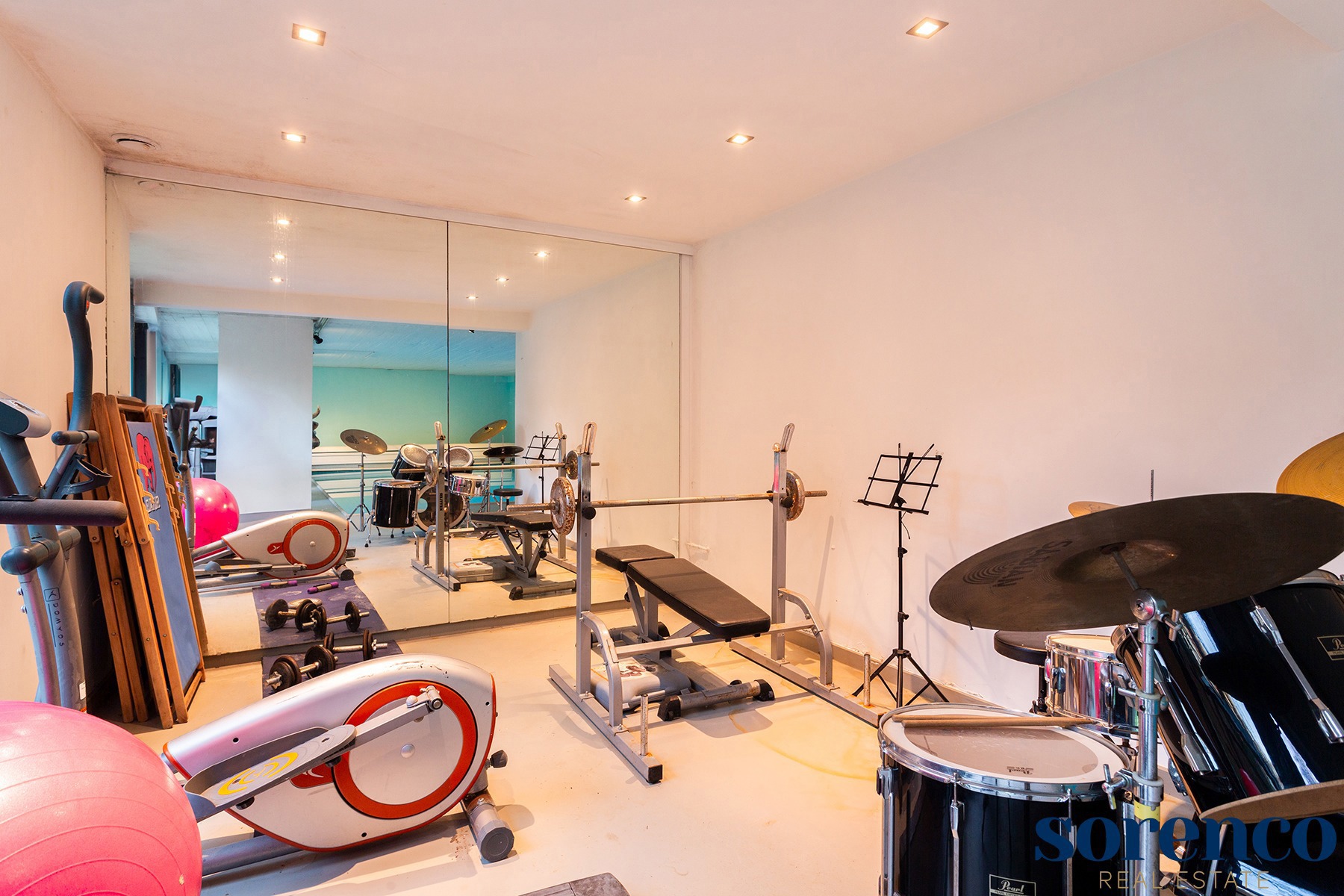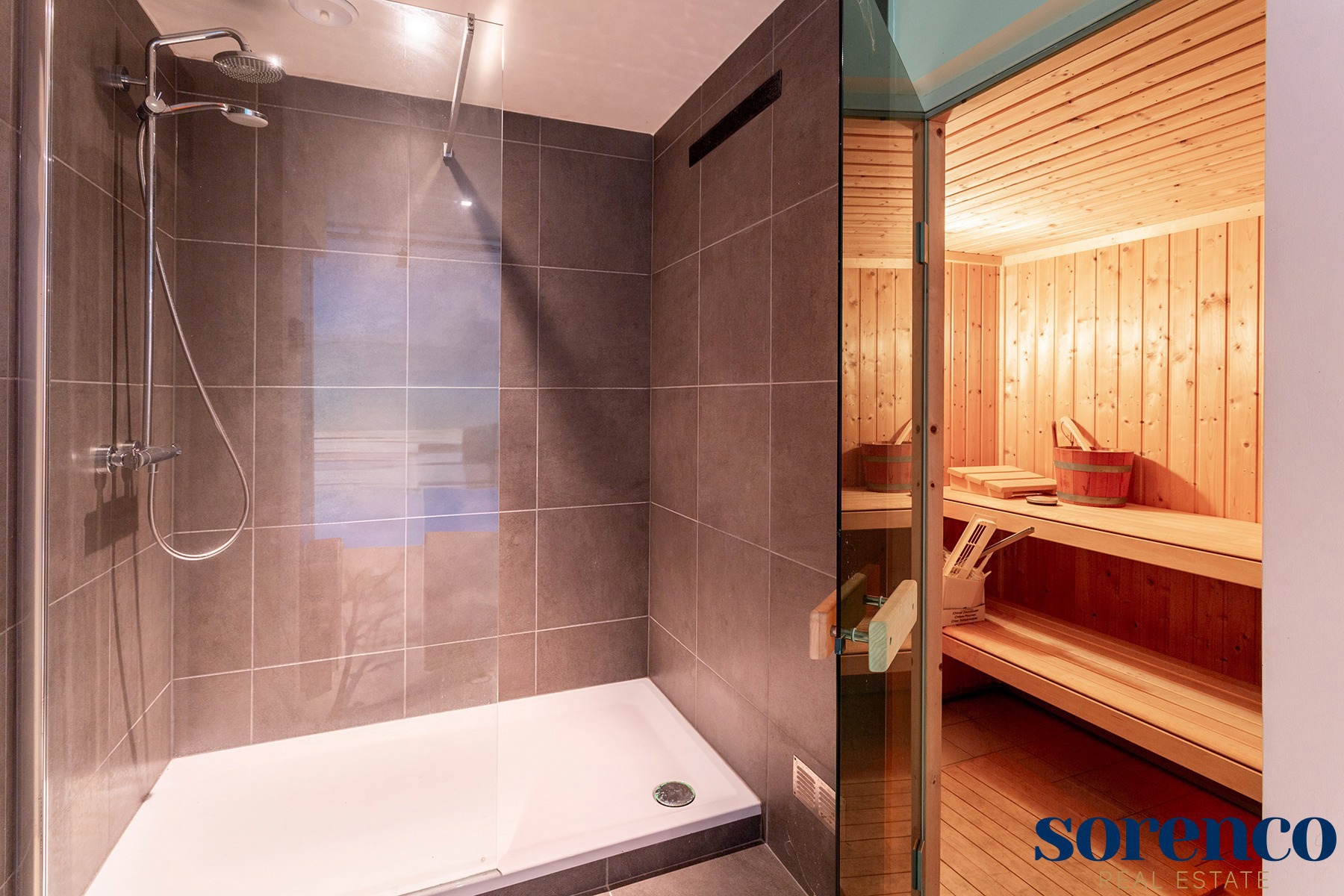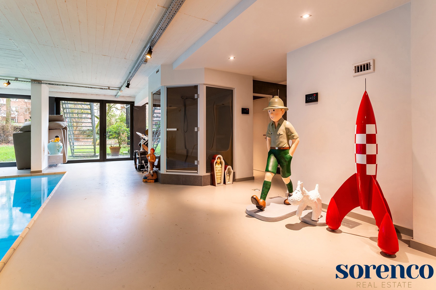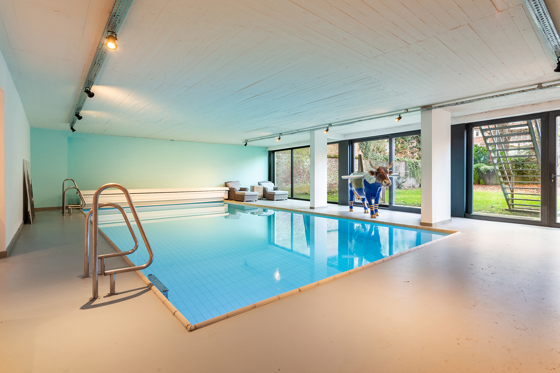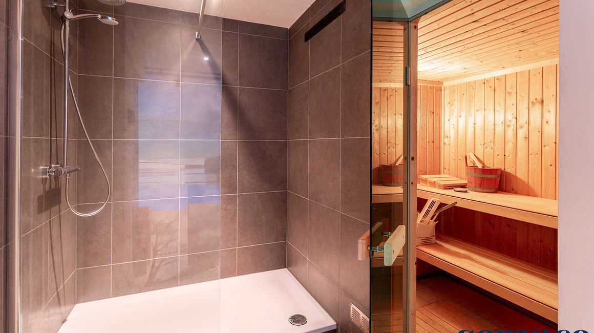 Een bijzonder unieke troef van dit appartement is de inpandige wellness-ruimte, die bereikbaar is via een privatieve lift. Hier vindt u een binnenzwembad, sauna, inloopregendouche, stoom cabine, apart toilet en een fitnessruimte. De schuiframen naar de tuin kunnen volledig worden geopend, waardoor binnen en buiten naadloos in elkaar overvloeien en deze ruimte een oase van rust biedt. Indien gewenst, kan deze ruimte volledig naar eigen inzicht anders worden ingericht.