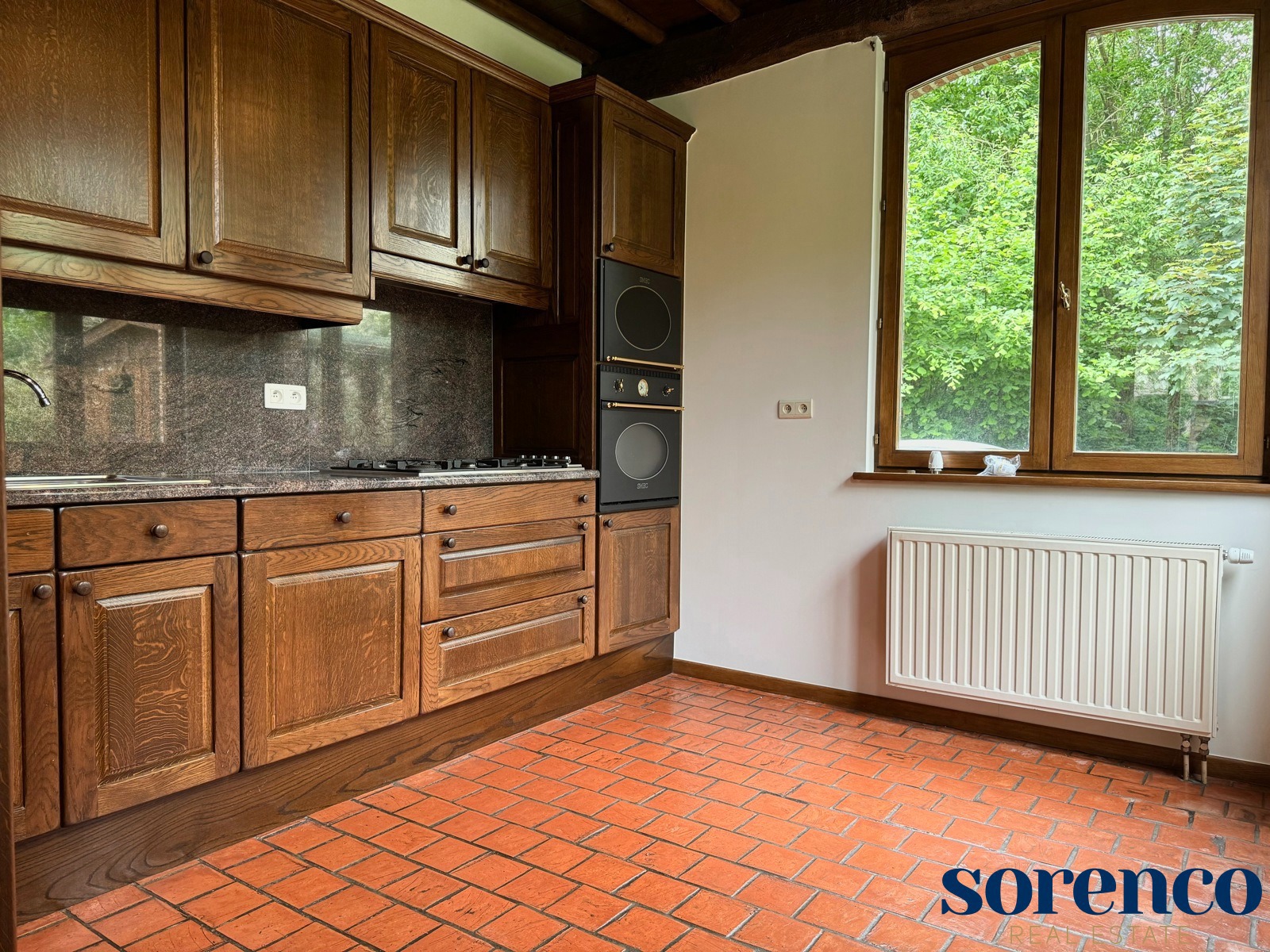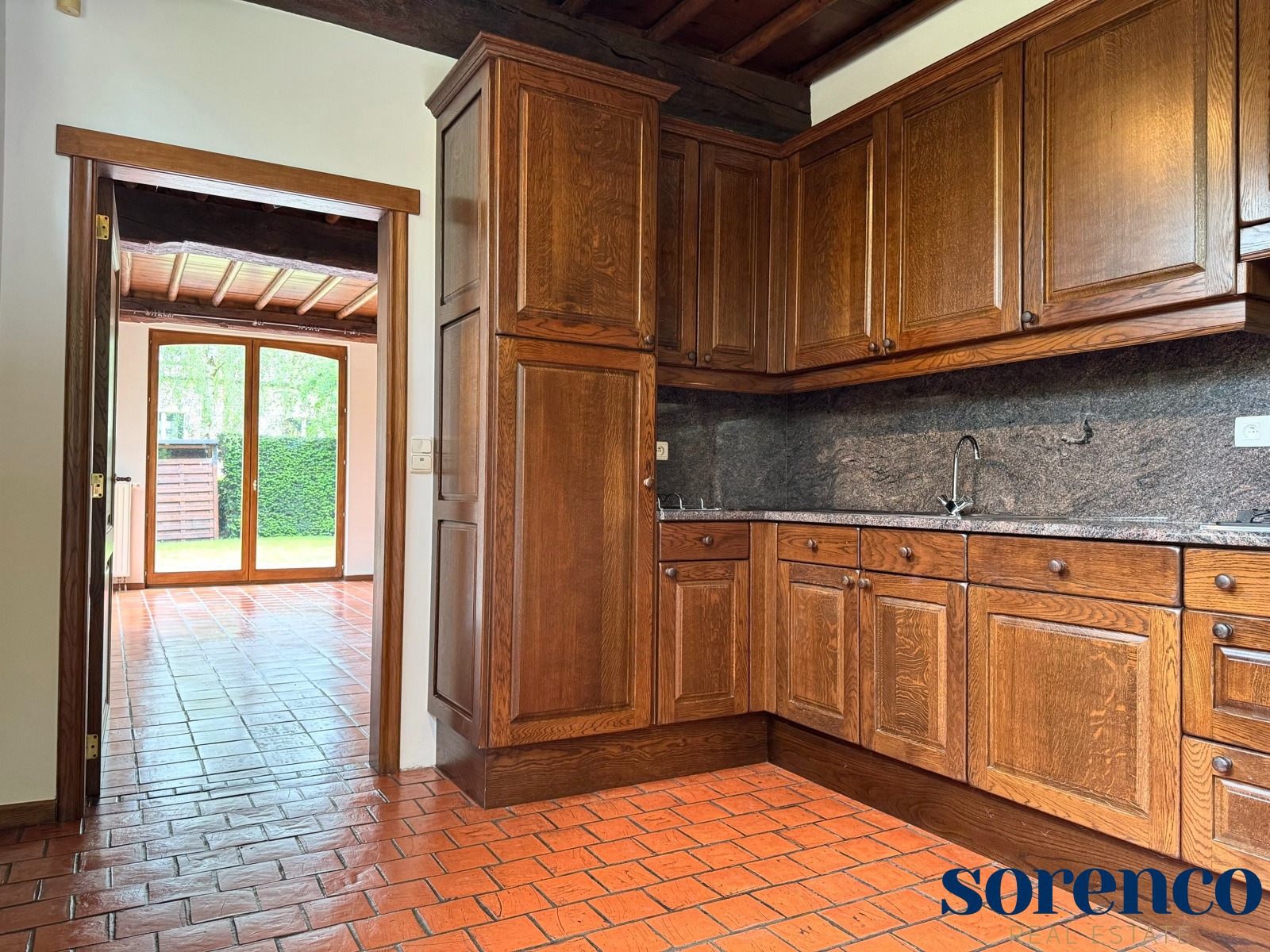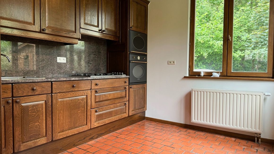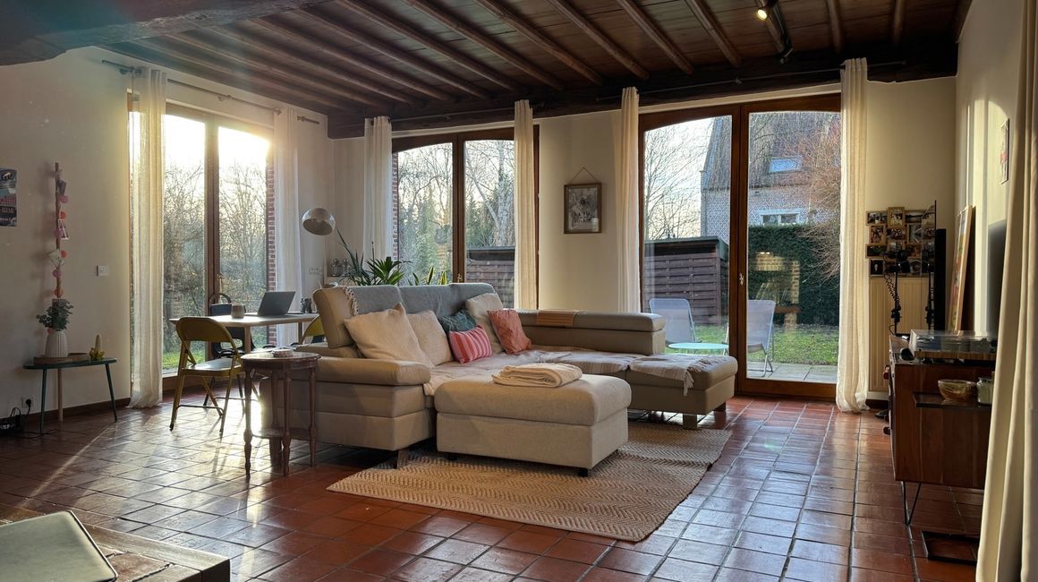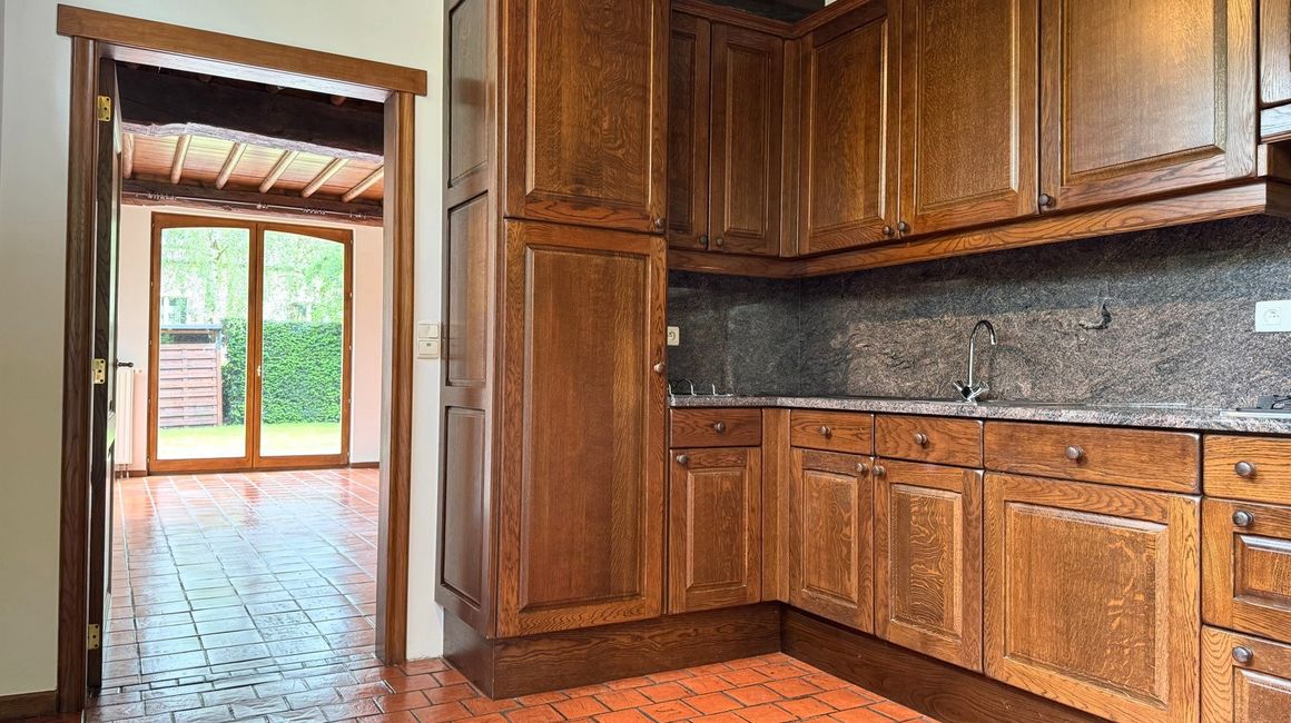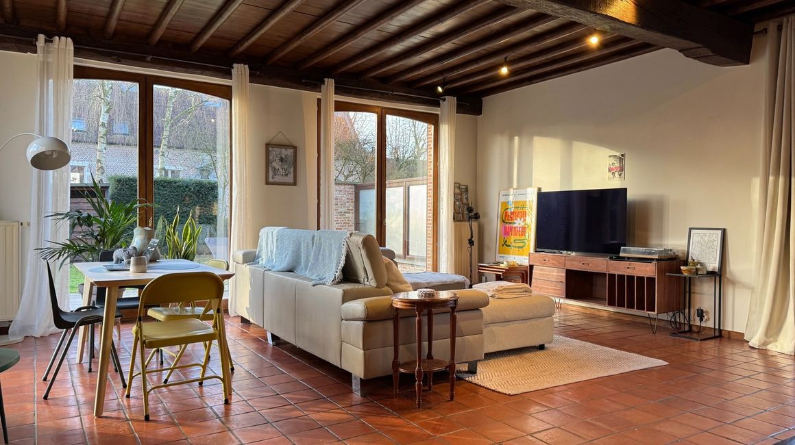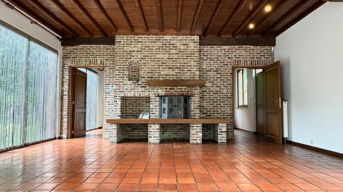 Karaktervolle en LEEFRUIMTE van ca. 40m² op authentieke terracotta tegels vergezelt met een charmante open haard., dewelke uitgeeft op het terras en de tuin. Volledig ingerichte KEUKEN voorzien van opbergkasten en toestellen; spoelbak, gasfornuis, dampkap, ijskast, vriezer, afwasmachine en oven.