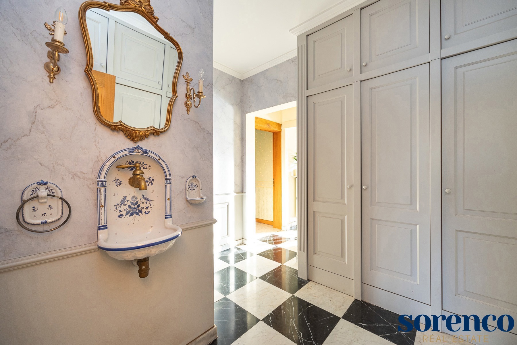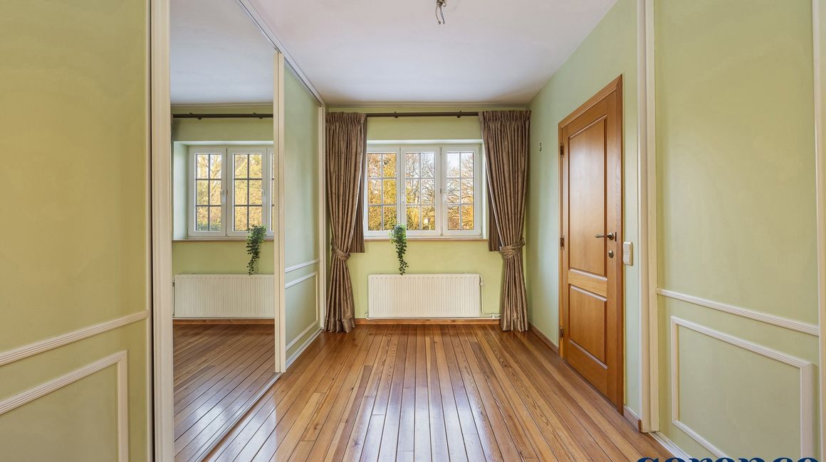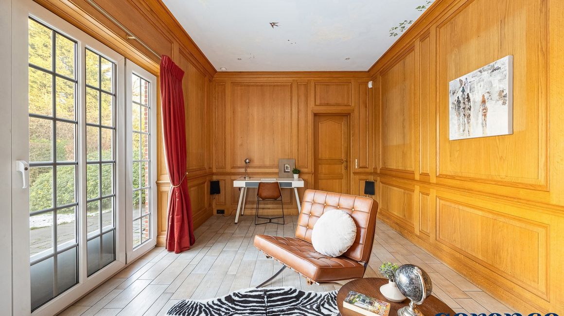 Bij binnenkomst via de ruime INKOMHAL (ca. 30m²), met apart toilet en vestiaire, betreedt u deze elegante woning. De riante en lichtrijke WOONKAMER (ca. 42m²) op parket met een originele open haard gaat naadloos over in de EETKAMER (ca. 36m²) en de TUSSENKAMER (ca. 15m²), welke gebruikt kan worden als eetplaats of extra bureauruimte. De ingerichte KEUKEN (ca. 12m²) biedt een prachtig uitzicht op de zuidelijk georiënteerde tuin. De recente keuken (2020) is voorzien van opbergkasten en alle toestellen, aansluitend een bijkeuken.