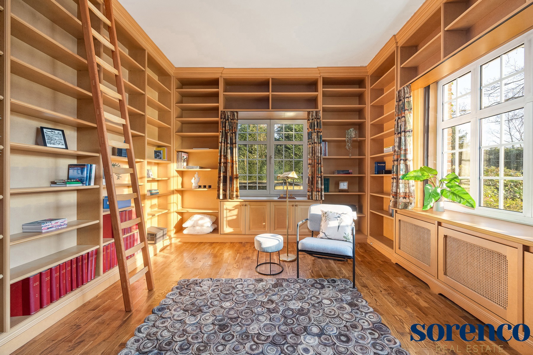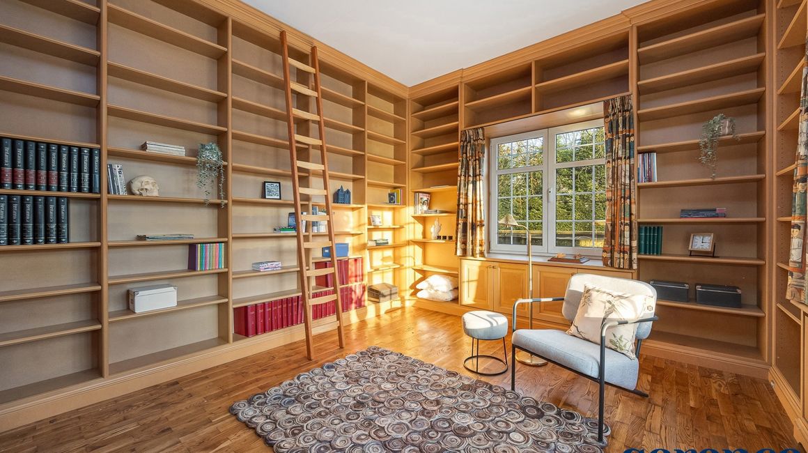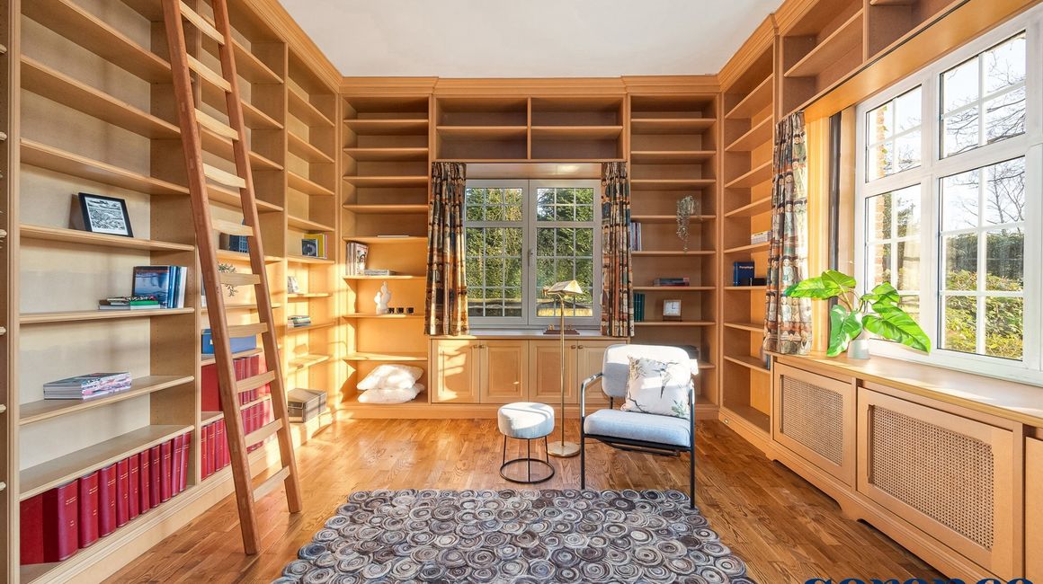 De centrale hal geeft u toegang tot de gezellige BIBLIOTHEEK (ca. 18 m²) / BUREAU vooraan op parket en een aparte ruime SLAAPKAMER (ca. 22 m²) met eigen DOUCHEKAMER voorzien van douche, toilet en lavabo.
