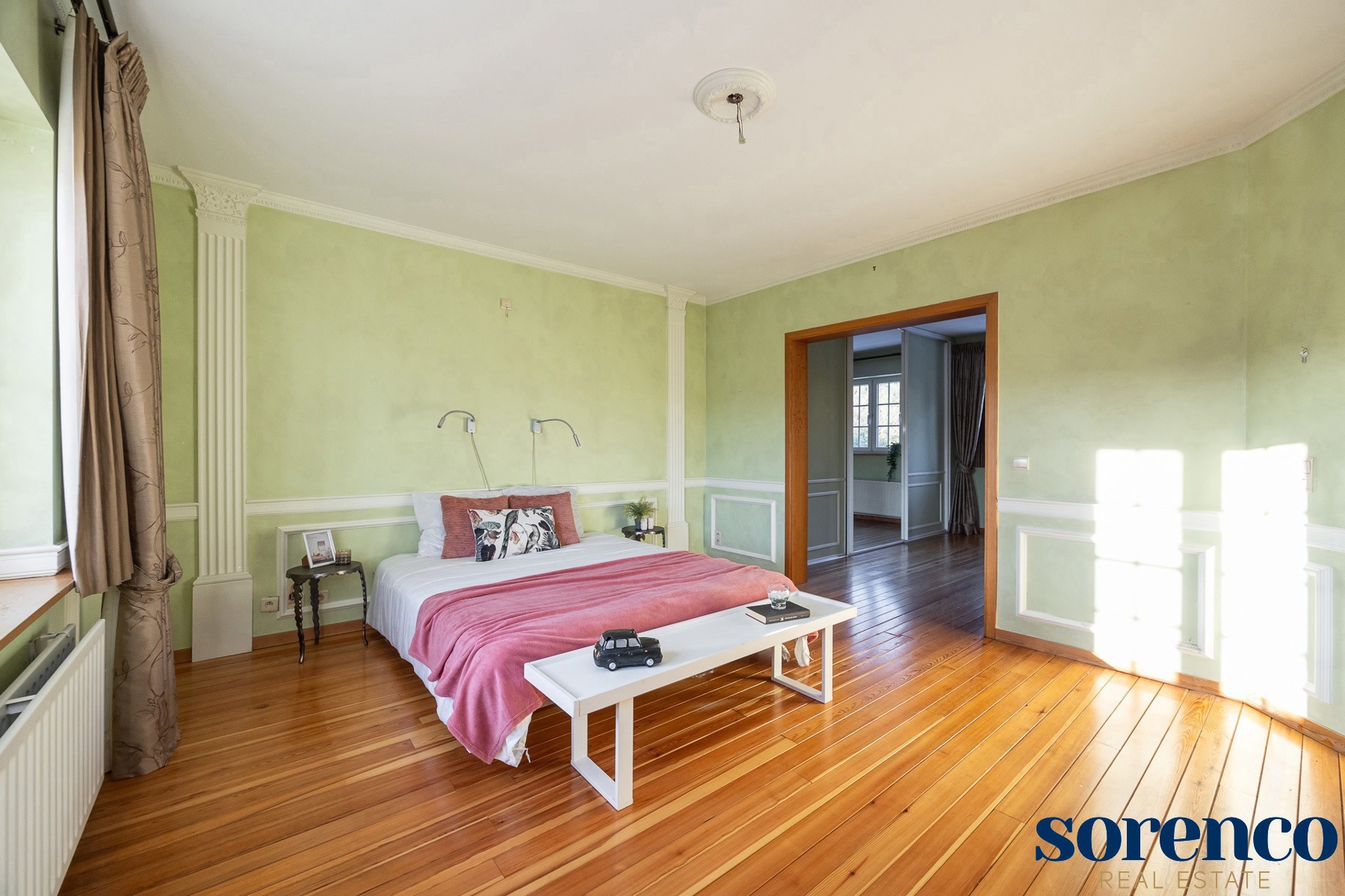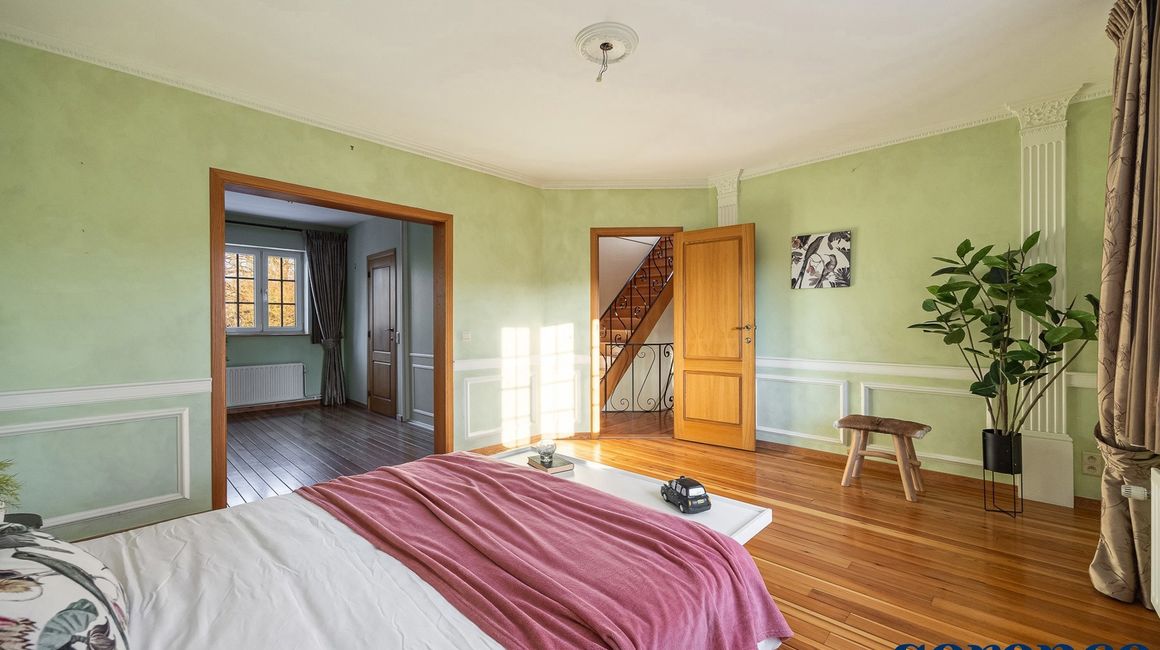 Eerste verdieping:De eerste verdieping beschikt over een overloop op parket met een apart toilet. De MASTERBEDROOM (ca. 18m²), ensuite de DRESSING ca. 10m² en een ingerichte BADKAMER. Deze is uitgerust met een ligbad, een inloopdouche, een dubbele lavabo in een meubel en een apart toilet.