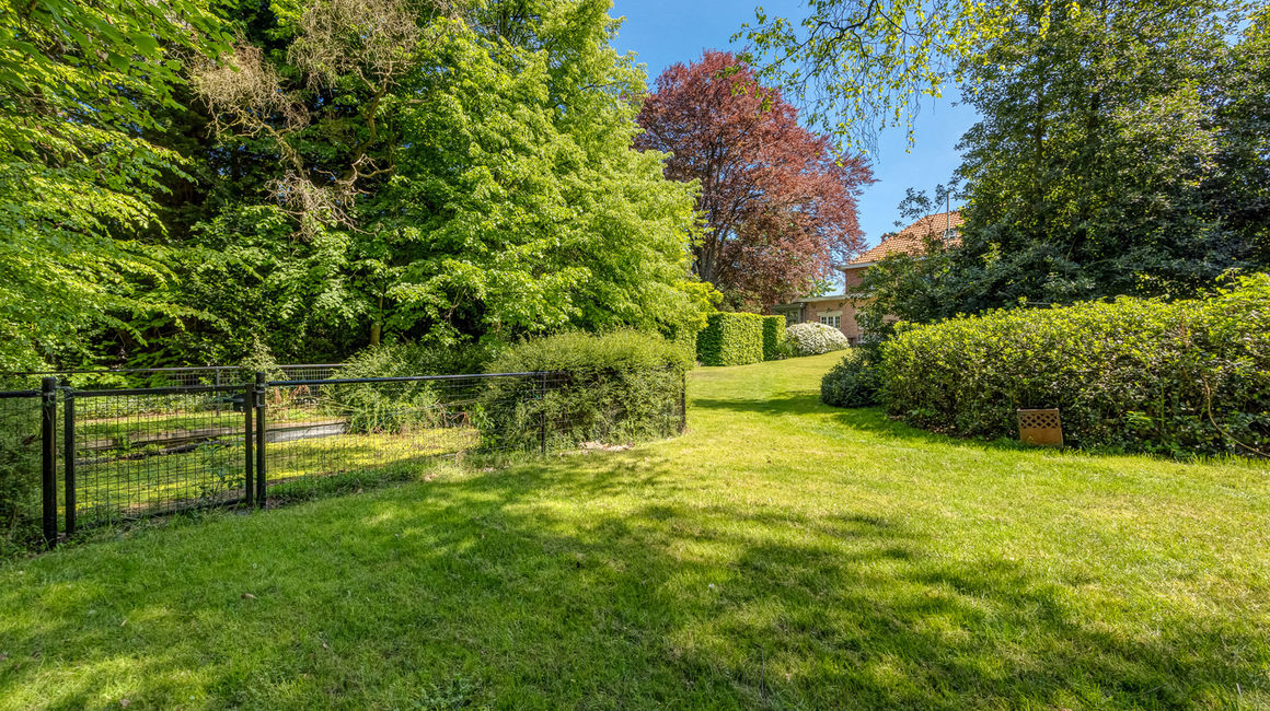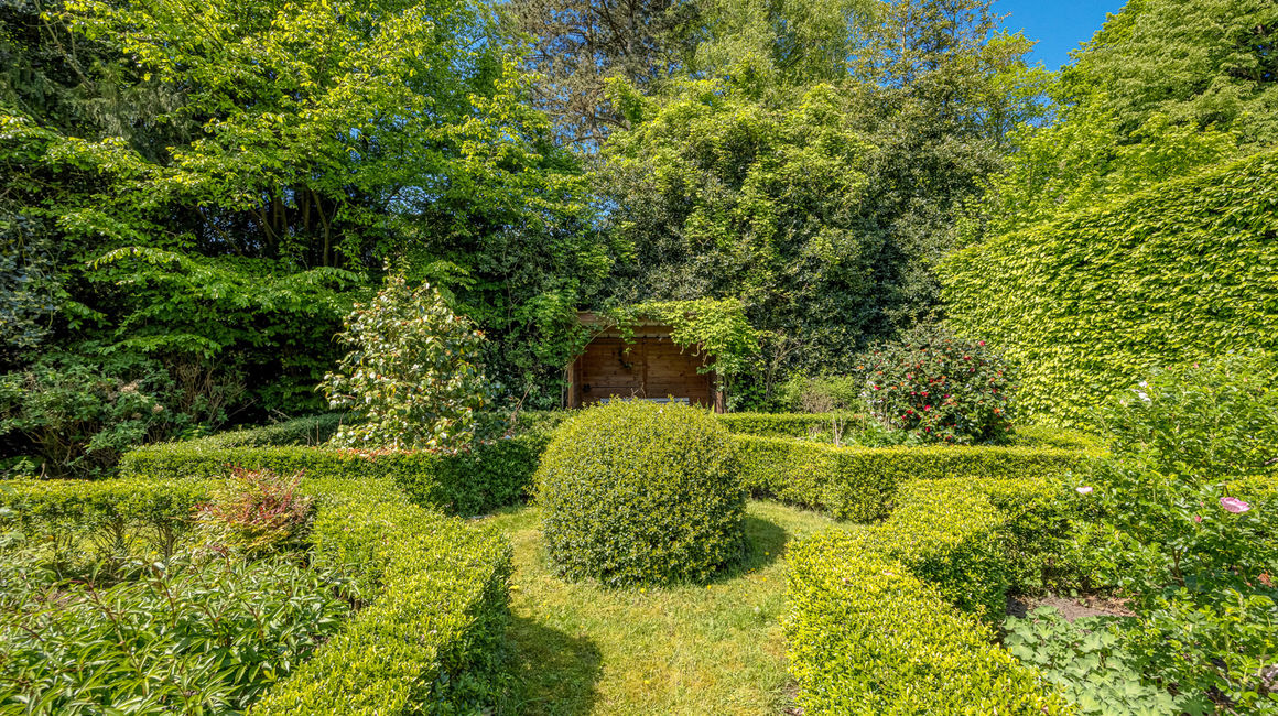 De tuin is prachtig aangelegd en ingedeeld in verschillende compartimenten: een fruitgaard, een kippenhok, speelhoek voor de kinderen, buxus met rozenperken, vijver en een extra bijgebouw/theehuis. Op de oprit zijn er meerdere parkeermogelijkheden voorzien.
