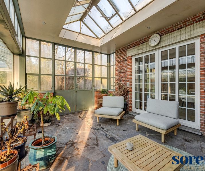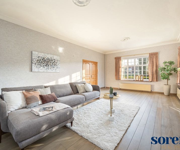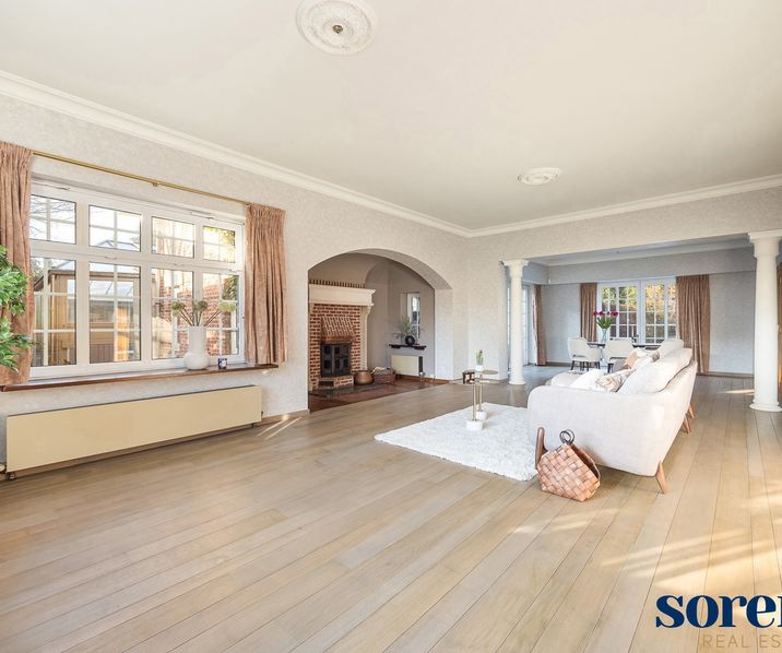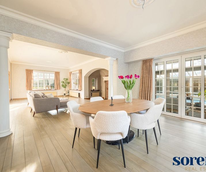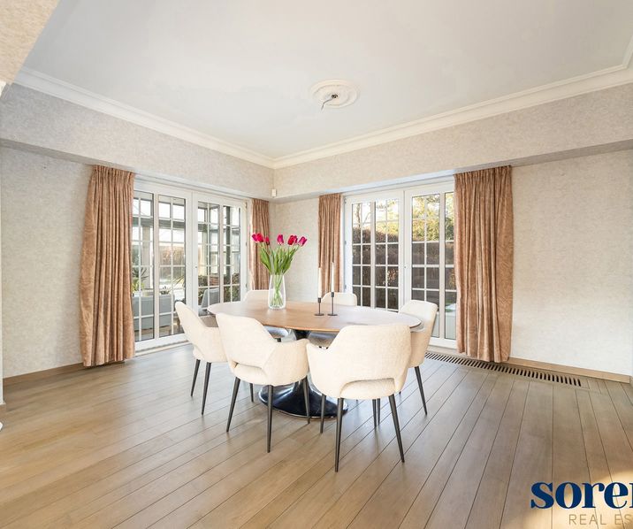 Bij binnenkomst via de ruime INKOMHAL (ca. 30mē), met apart toilet en vestiaire, betreedt u deze elegante woning. De riante en lichtrijke WOONKAMER (ca. 42mē) op parket met een originele open haard gaat naadloos over in de EETKAMER (ca. 36mē) en de TUSSENKAMER (ca. 15mē), welke gebruikt kan worden als eetplaats of extra bureauruimte. De ingerichte KEUKEN (ca. 12mē) biedt een prachtig uitzicht op de zuidelijk georiënteerde tuin. De recente keuken (2020) is voorzien van opbergkasten en alle toestellen, aansluitend een bijkeuken.