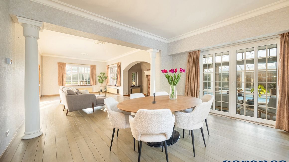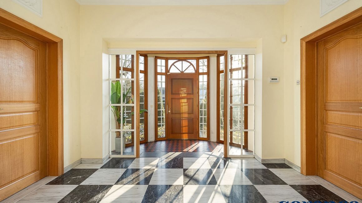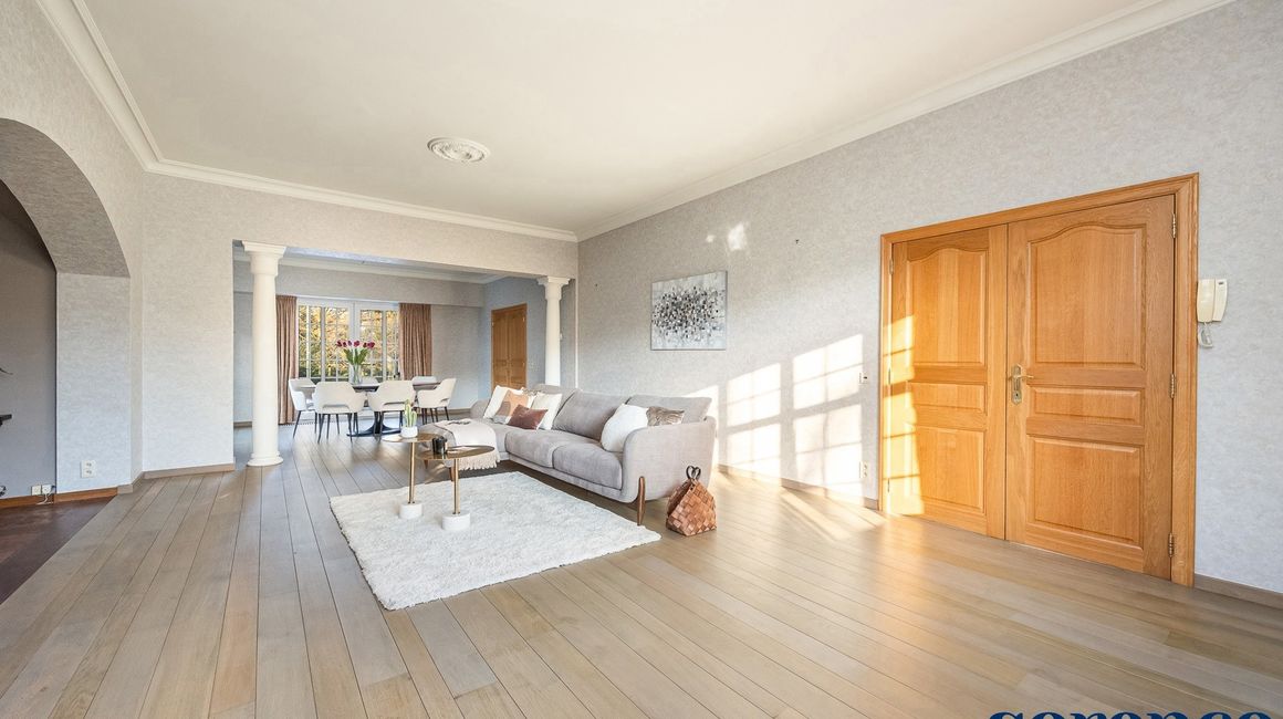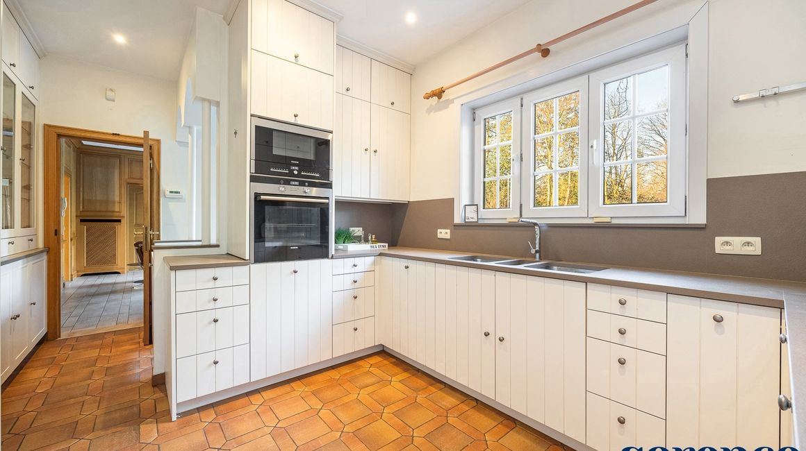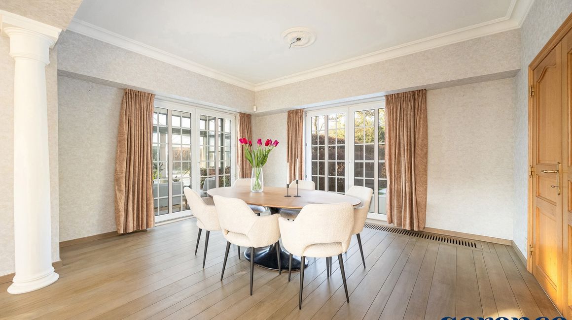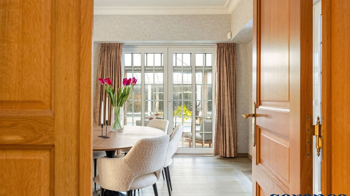 Bij binnenkomst via de ruime INKOMHAL (ca. 30m²), met apart toilet en vestiaire, betreedt u deze elegante woning. De riante en lichtrijke WOONKAMER (ca. 42m²) op parket met een originele open haard gaat naadloos over in de EETKAMER (ca. 36m²) en de TUSSENKAMER (ca. 15m²), welke gebruikt kan worden als eetplaats of extra bureauruimte. De ingerichte KEUKEN (ca. 12m²) biedt een prachtig uitzicht op de zuidelijk georiënteerde tuin. De recente keuken (2020) is voorzien van opbergkasten en alle toestellen, aansluitend een bijkeuken.