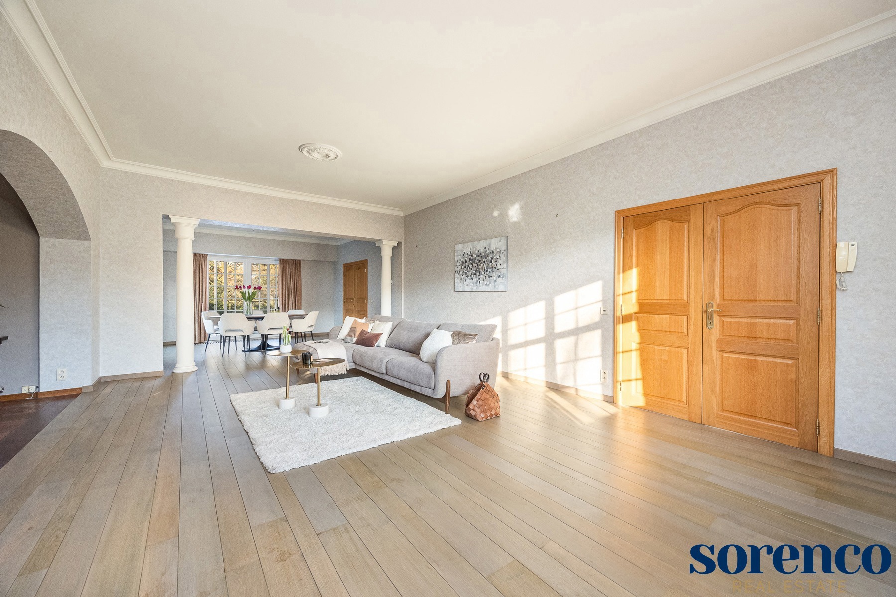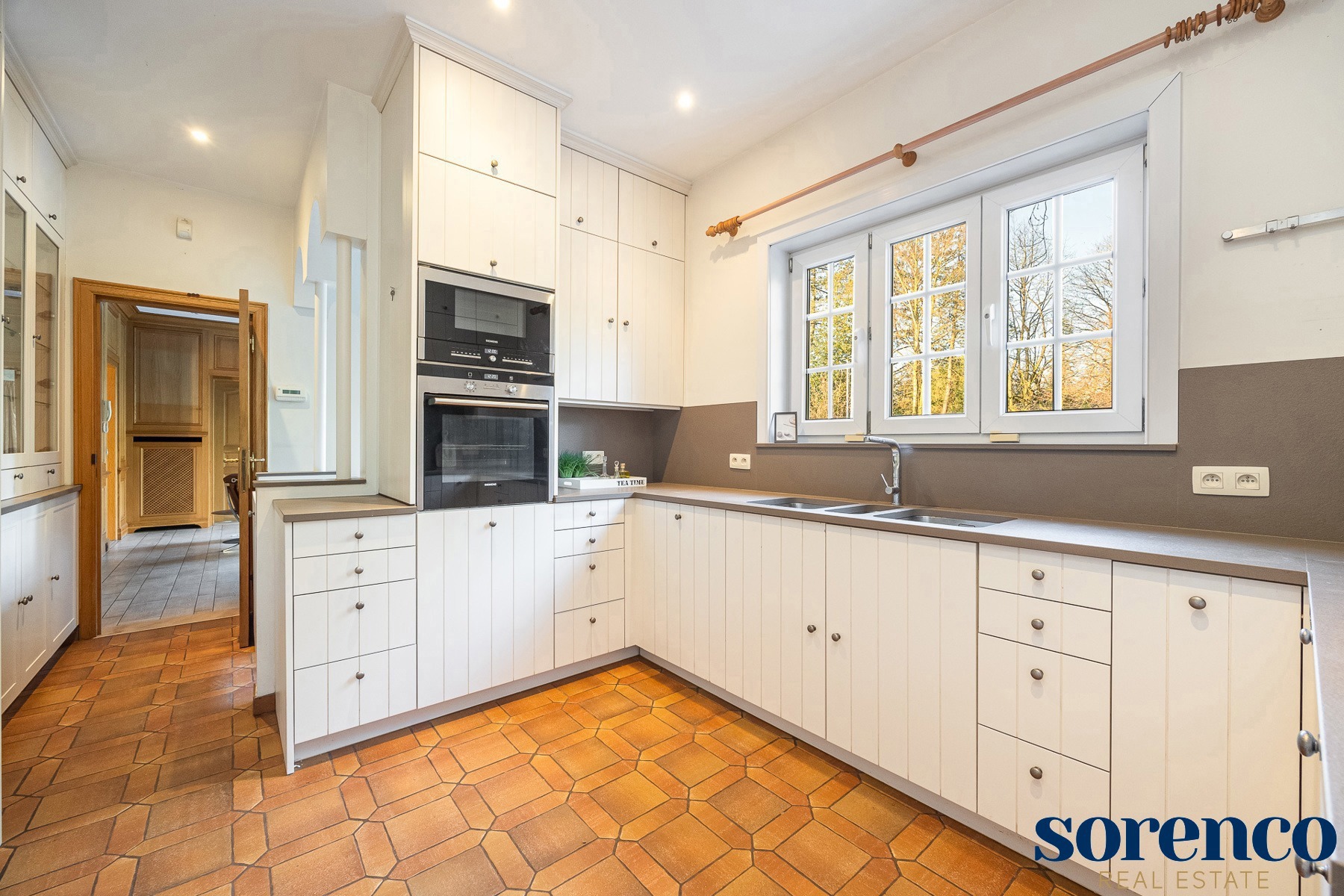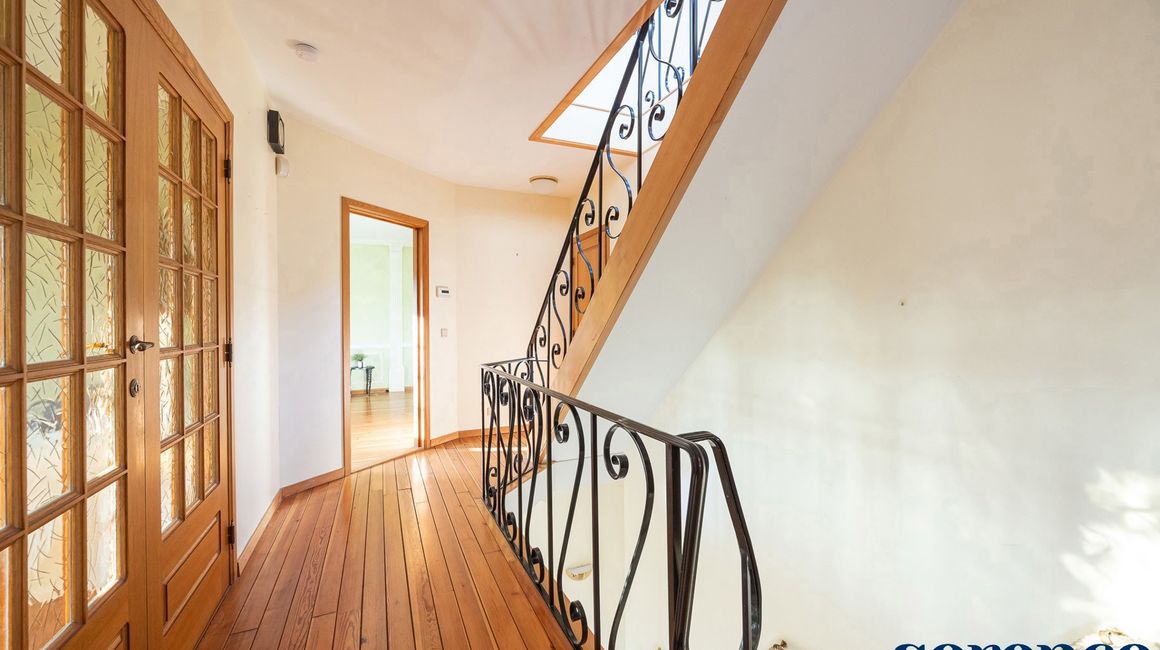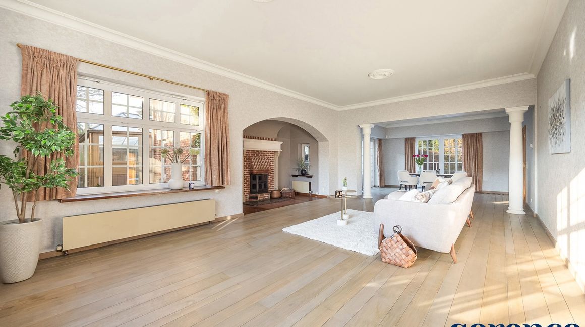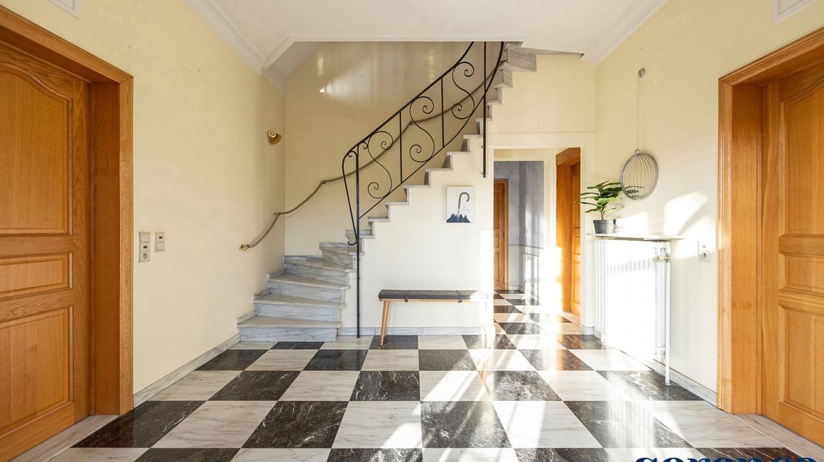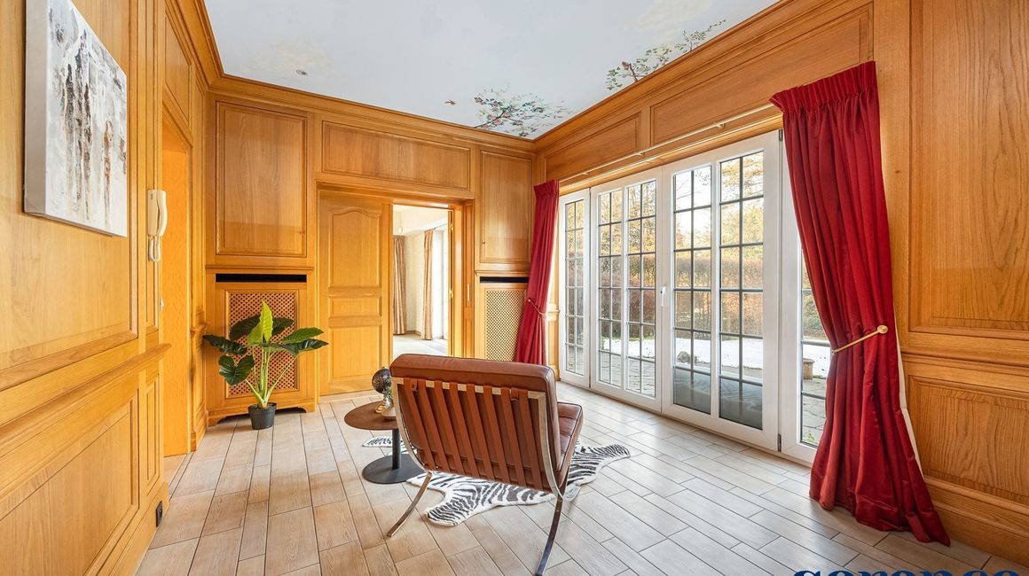 Bij binnenkomst via de ruime INKOMHAL (ca. 30m²), met apart toilet en vestiaire, betreedt u deze elegante woning. De riante en lichtrijke WOONKAMER (ca. 42m²) op parket met een originele open haard gaat naadloos over in de EETKAMER (ca. 36m²) en de TUSSENKAMER (ca. 15m²), welke gebruikt kan worden als eetplaats of extra bureauruimte. De ingerichte KEUKEN (ca. 12m²) biedt een prachtig uitzicht op de zuidelijk georiënteerde tuin. De recente keuken (2020) is voorzien van opbergkasten en alle toestellen, aansluitend een bijkeuken.