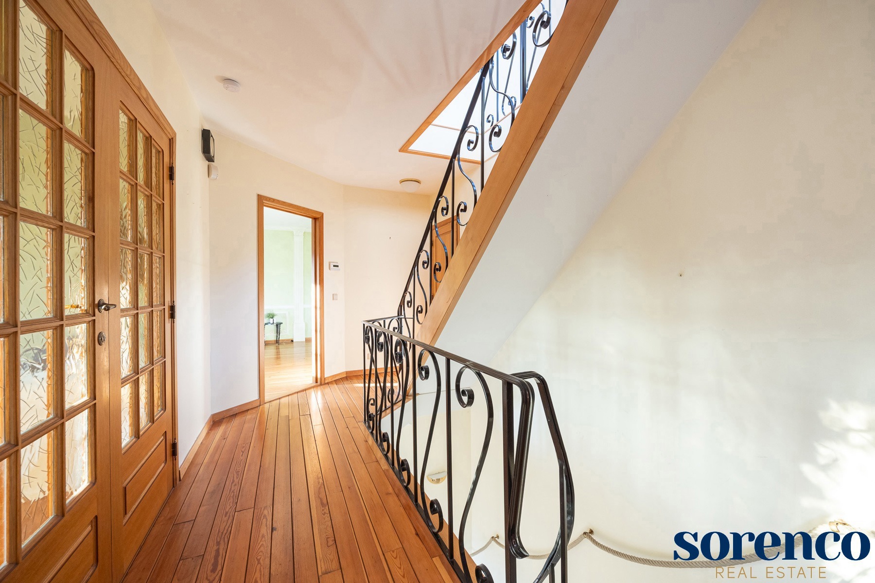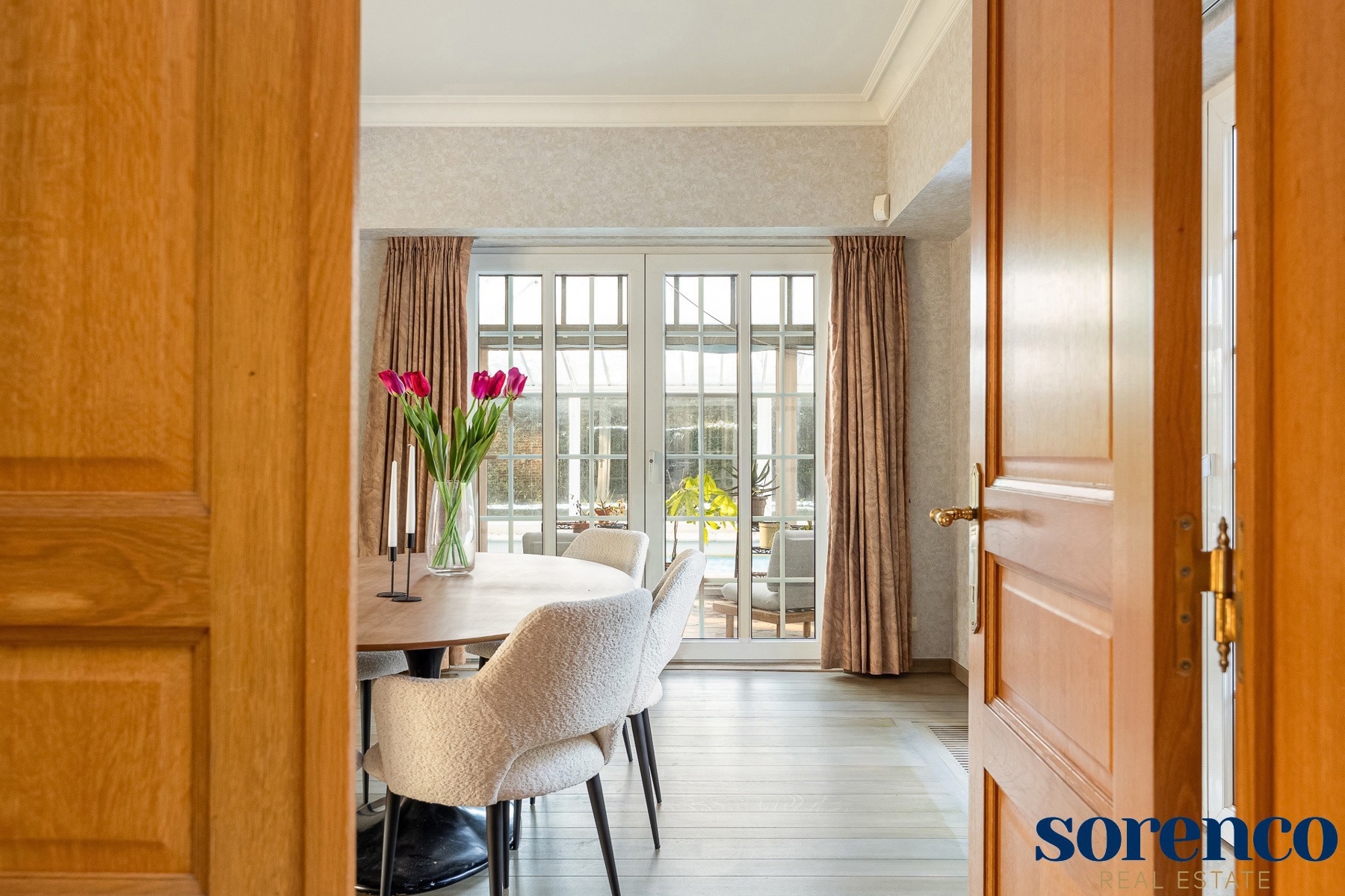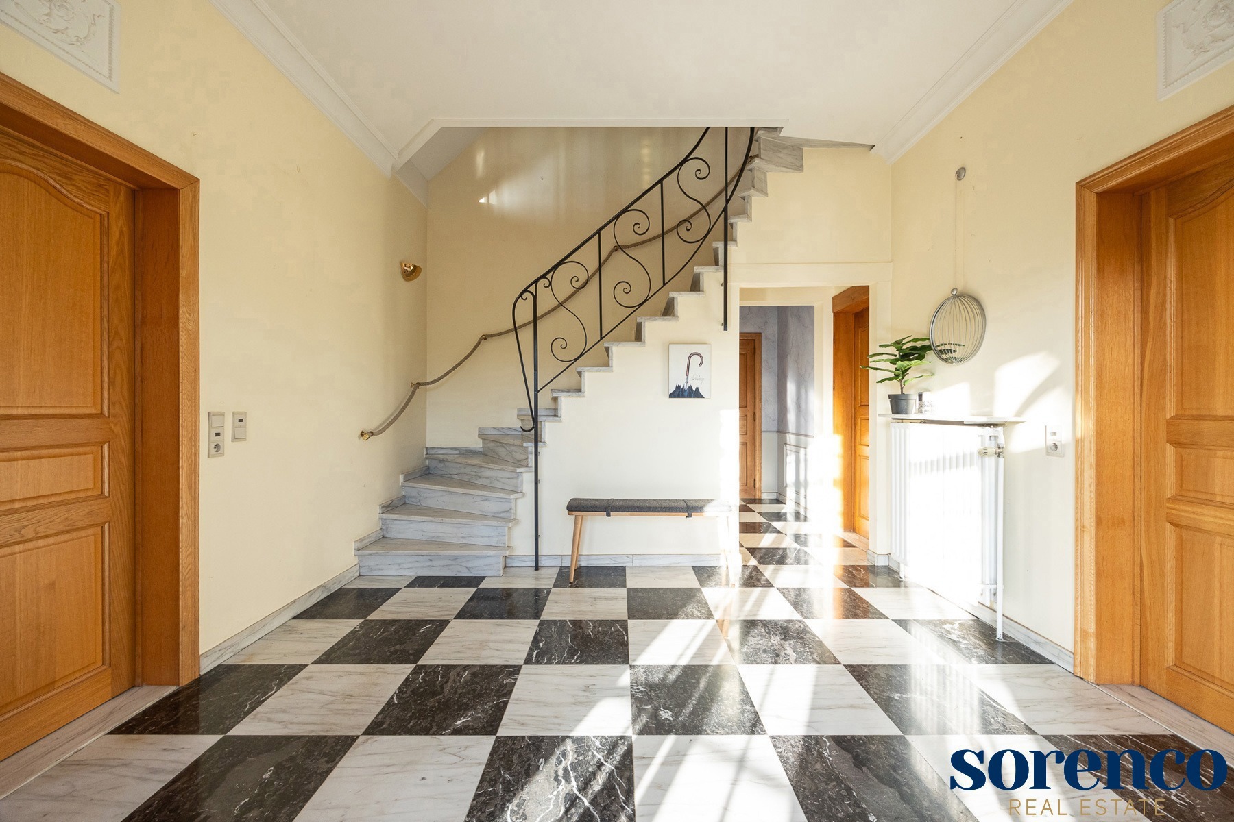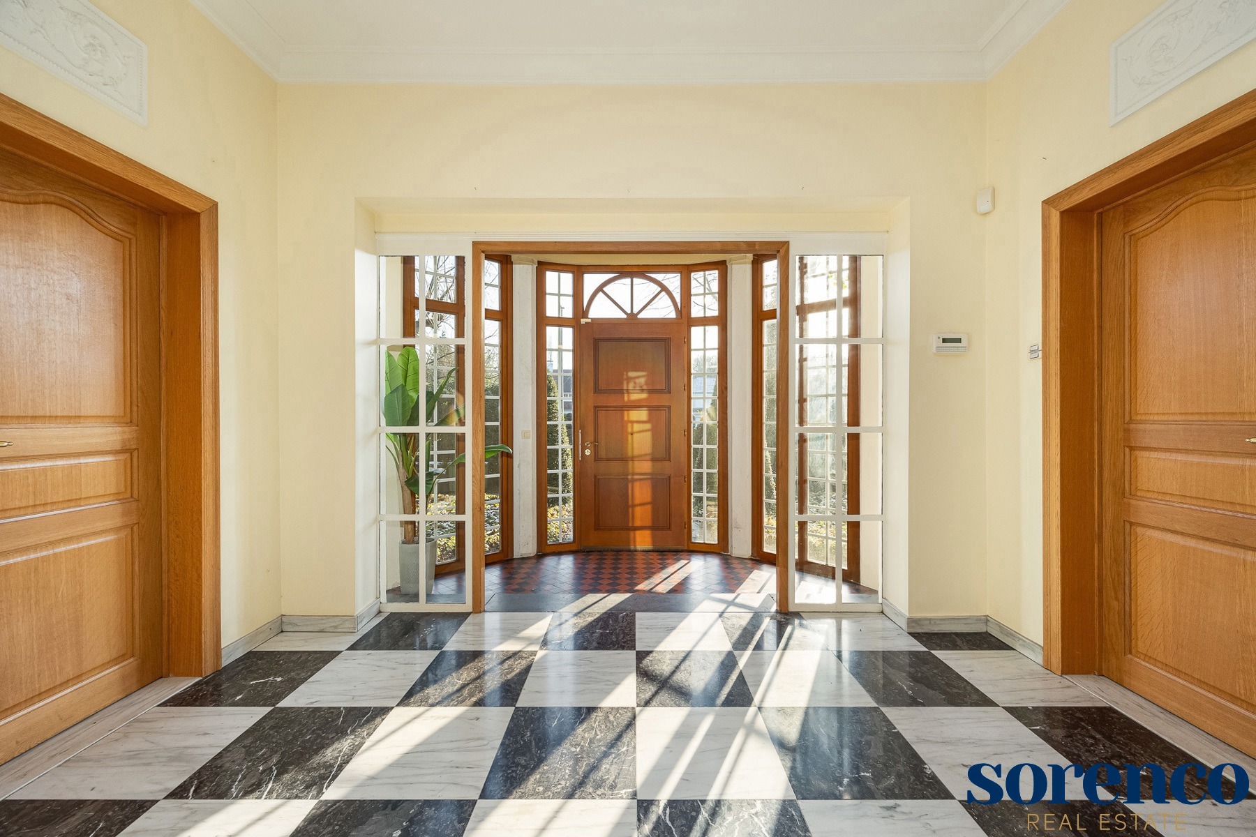 Bij binnenkomst via de ruime INKOMHAL (ca. 30m²), met apart toilet en vestiaire, betreedt u deze elegante woning. De riante en lichtrijke WOONKAMER (ca. 42m²) op parket met een originele open haard gaat naadloos over in de EETKAMER (ca. 36m²) en de TUSSENKAMER (ca. 15m²), welke gebruikt kan worden als eetplaats of extra bureauruimte. De ingerichte KEUKEN (ca. 12m²) biedt een prachtig uitzicht op de zuidelijk georiënteerde tuin. De recente keuken (2020) is voorzien van opbergkasten en alle toestellen, aansluitend een bijkeuken.