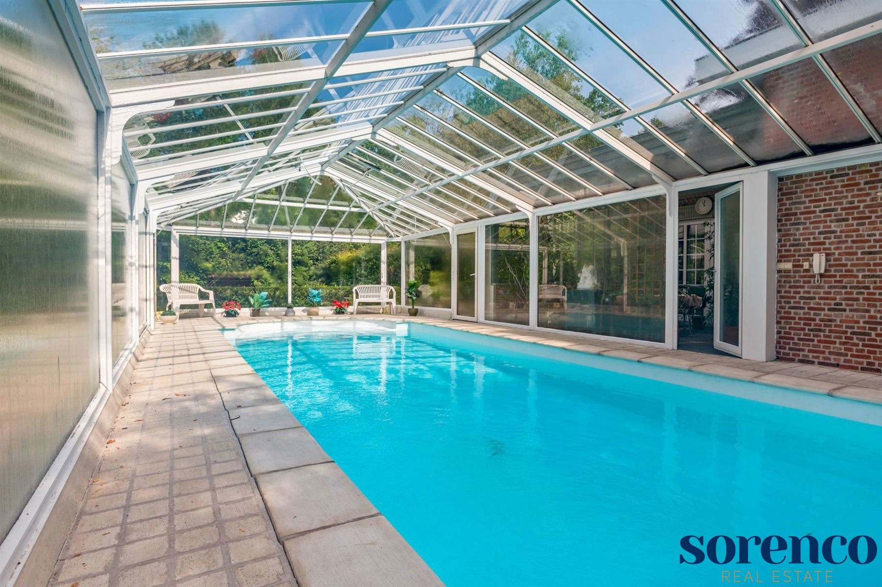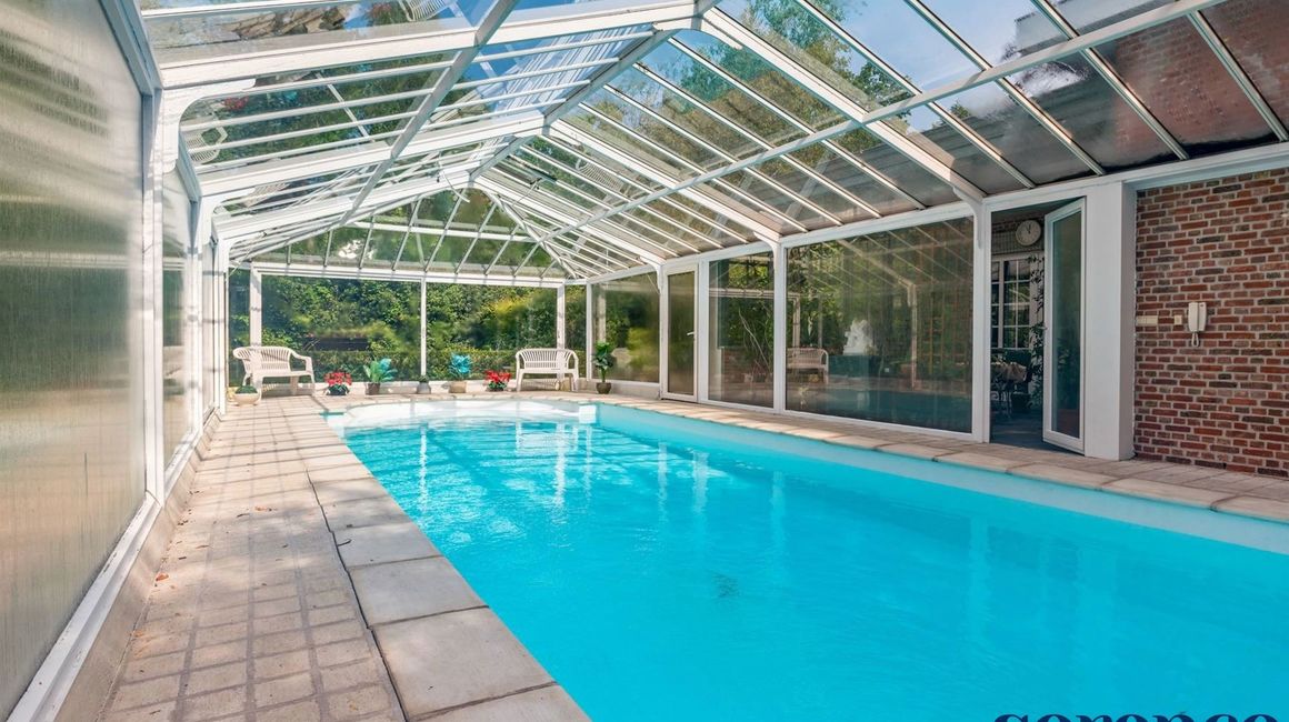 Aan de leefruimte heeft u een gezellige orangerie, welke uitgeeft op het overdekte ZWEMBAD (ca. 4 m x 12 m voor het zwembad en 6,30m op 18m voor de overkapping), inclusief een aparte DOUCHEKAMER.