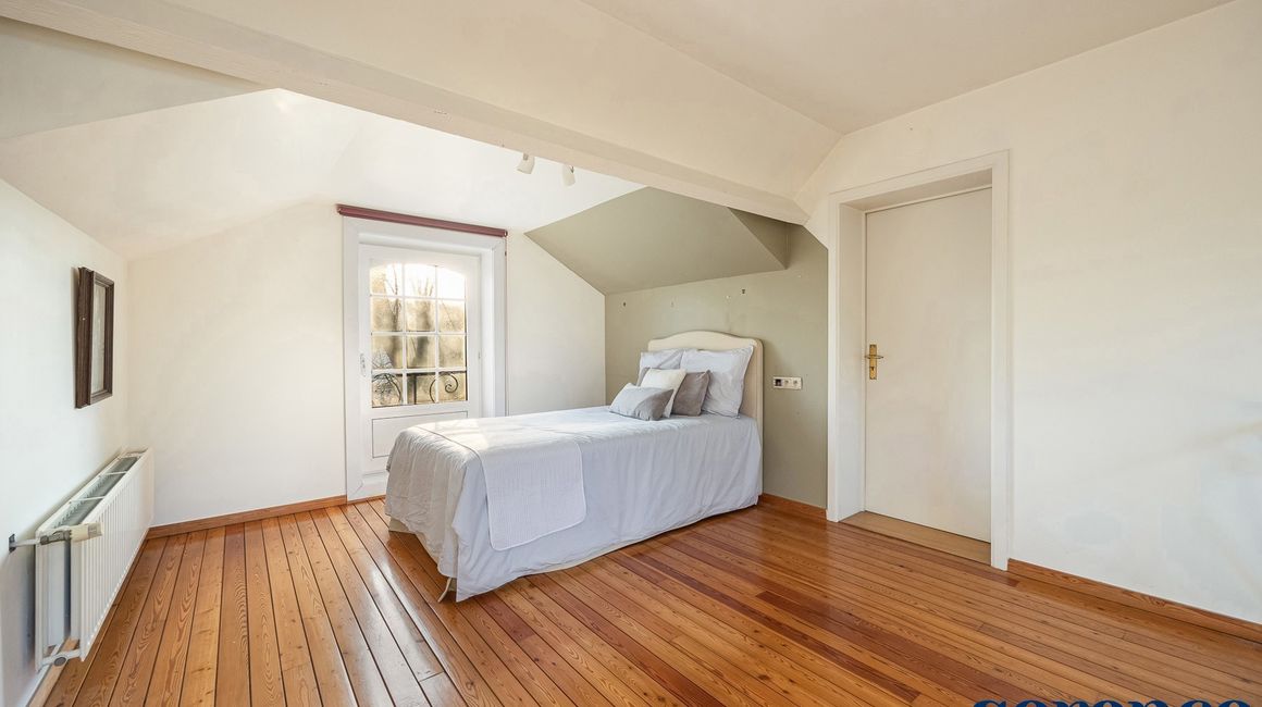 De centrale hal geeft u toegang tot de gezellige BIBLIOTHEEK (ca. 18 m²) / BUREAU vooraan op parket en een aparte ruime SLAAPKAMER (ca. 22 m²) met eigen DOUCHEKAMER voorzien van douche, toilet en lavabo.