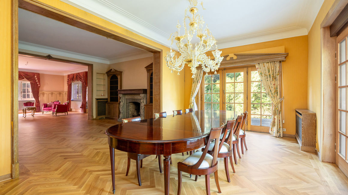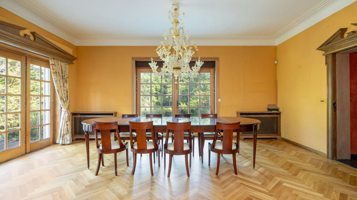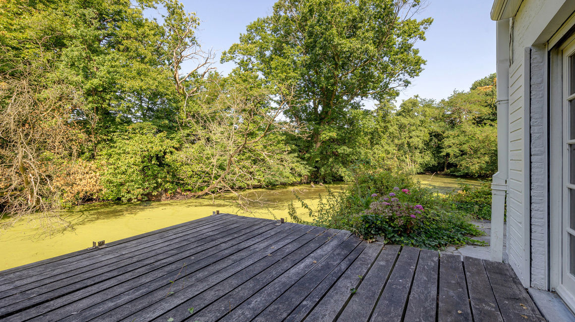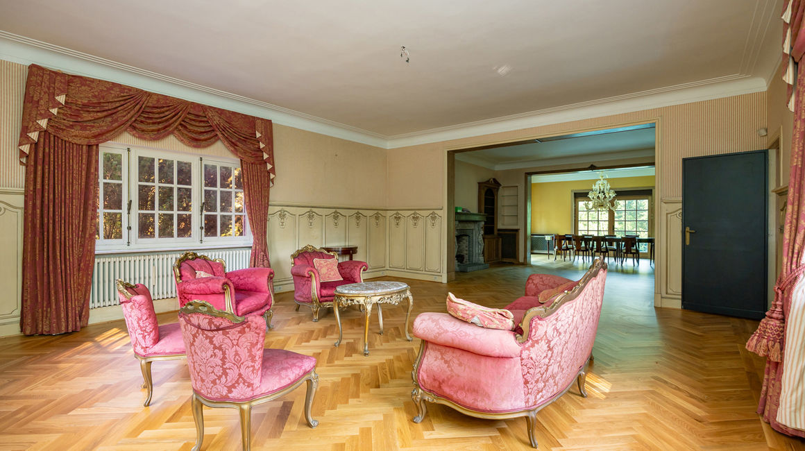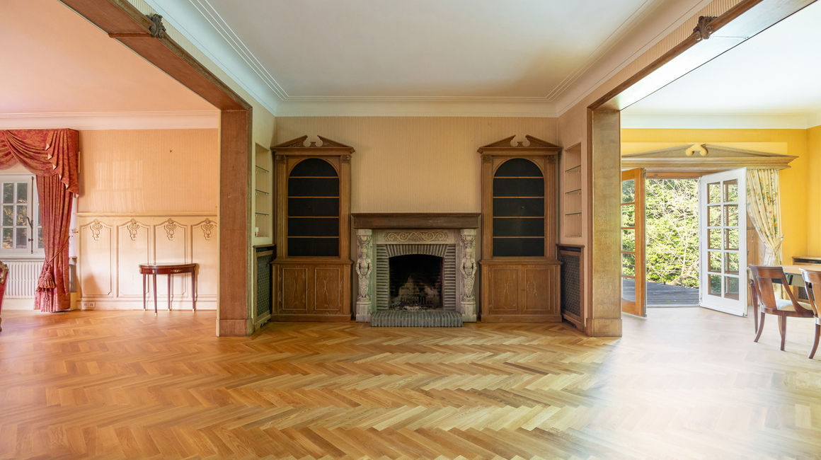 Royale LEEFRUIMTE op ingelegde parket bestaande uit een 3 delen: een dubbel SALON voorzien van een centrale open haard met bewerkte schouwmantel, ingebouwde kasten met barkast. EETKAMER op parket. De vensterdeuren van de eetkamer geven uit op het TERRAS met eiken planken en een elektrische zonnetent. Het terras heeft uitzicht over de vijver. Het open terras gaat achteraan over naar een overdekt terras. Verder heeft u de te renoveren aparte rustieke leefkeuken. Naast de keuken bevindt zich een onbijtkamer / bureel of jachtkamer op een plankenvloer, deze is ook toegankelijk via de hal.