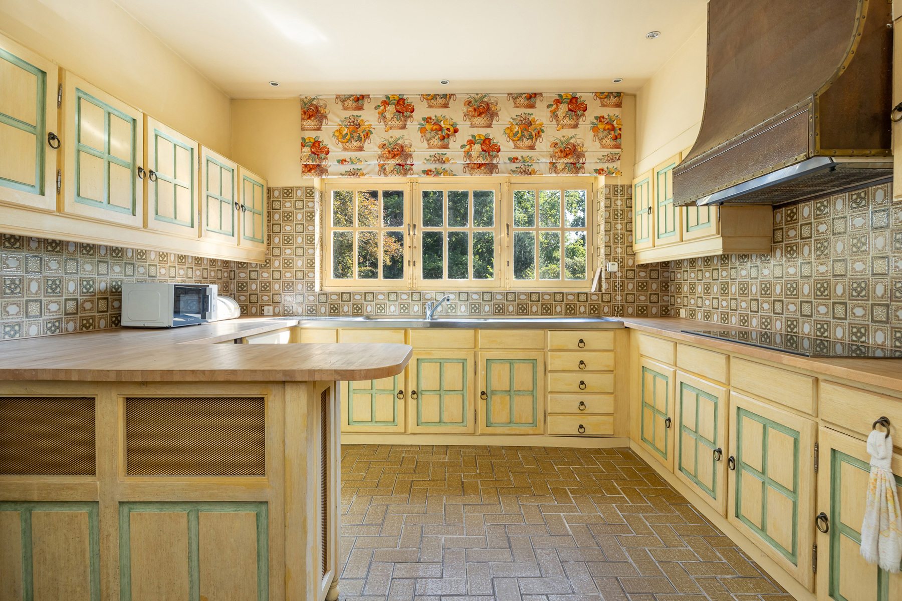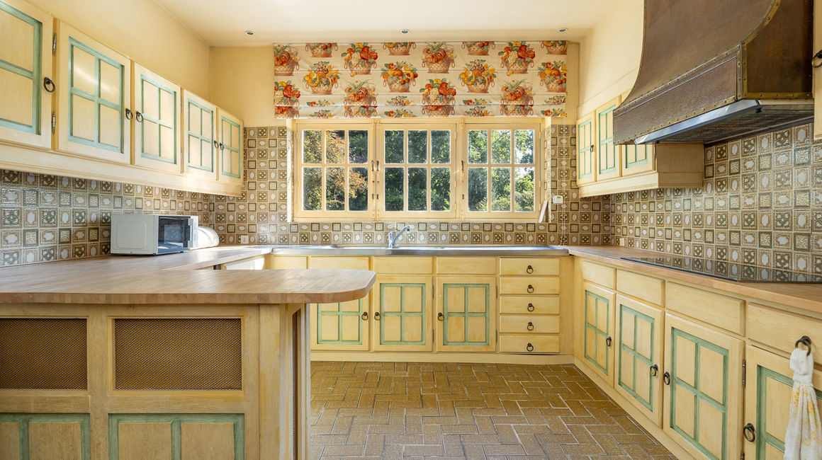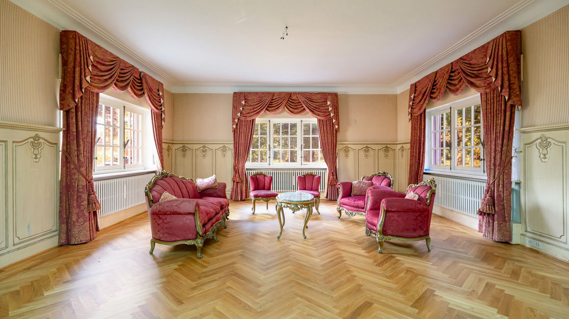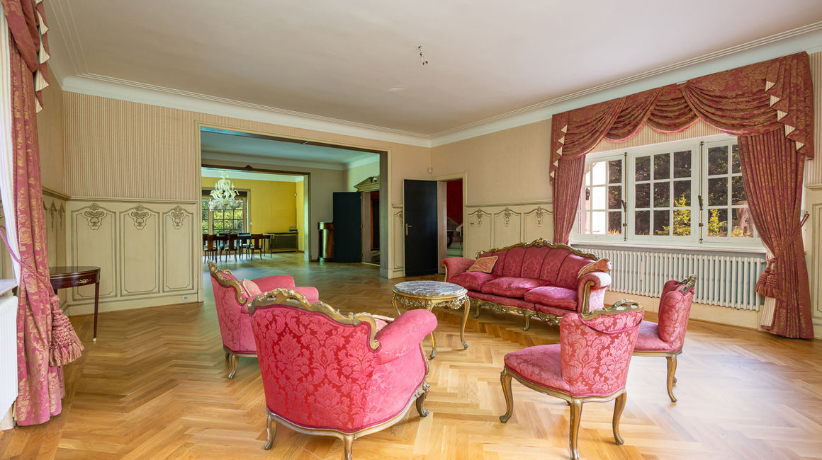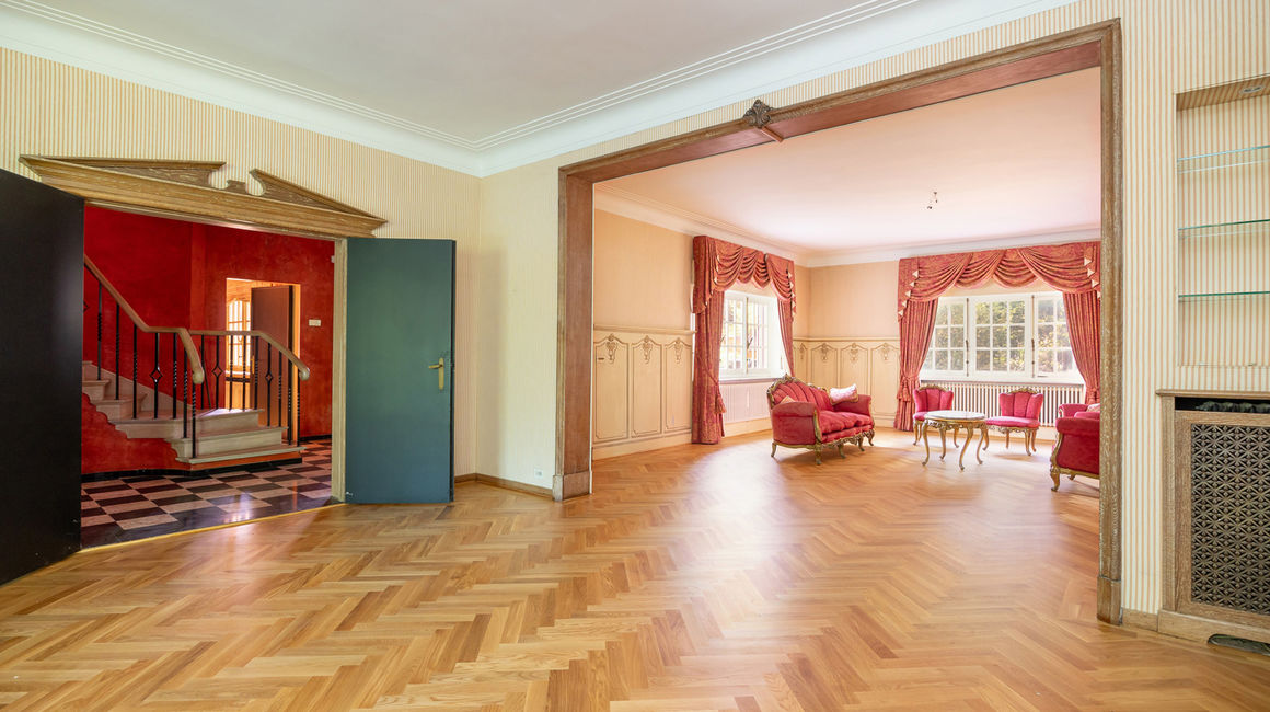 Royale LEEFRUIMTE op ingelegde parket bestaande uit een 3 delen: een dubbel SALON voorzien van een centrale open haard met bewerkte schouwmantel, ingebouwde kasten met barkast. EETKAMER op parket. De vensterdeuren van de eetkamer geven uit op het TERRAS met eiken planken en een elektrische zonnetent. Het terras heeft uitzicht over de vijver. Het open terras gaat achteraan over naar een overdekt terras. Verder heeft u de te renoveren aparte rustieke leefkeuken. Naast de keuken bevindt zich een onbijtkamer / bureel of jachtkamer op een plankenvloer, deze is ook toegankelijk via de hal.