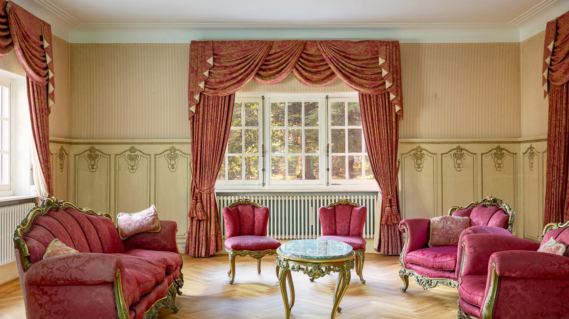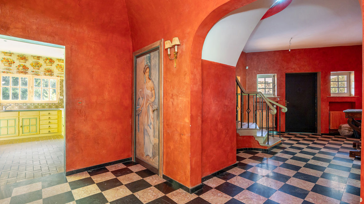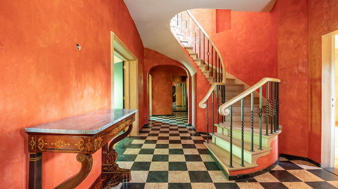 Via een bordestrap betreedt men de imposante Italiaans rood-gelakte INKOMHAL op een marmeren vloer met gastentoilet en vestiaire