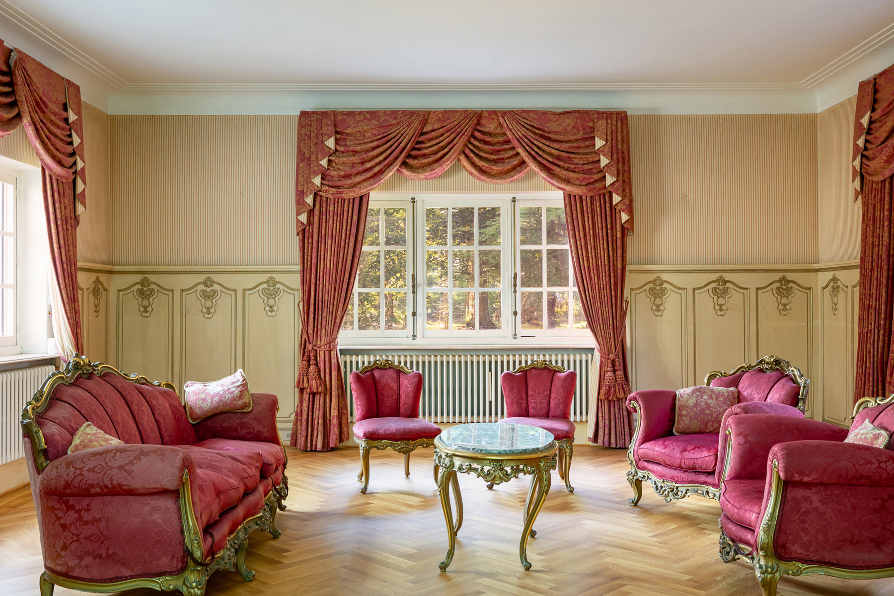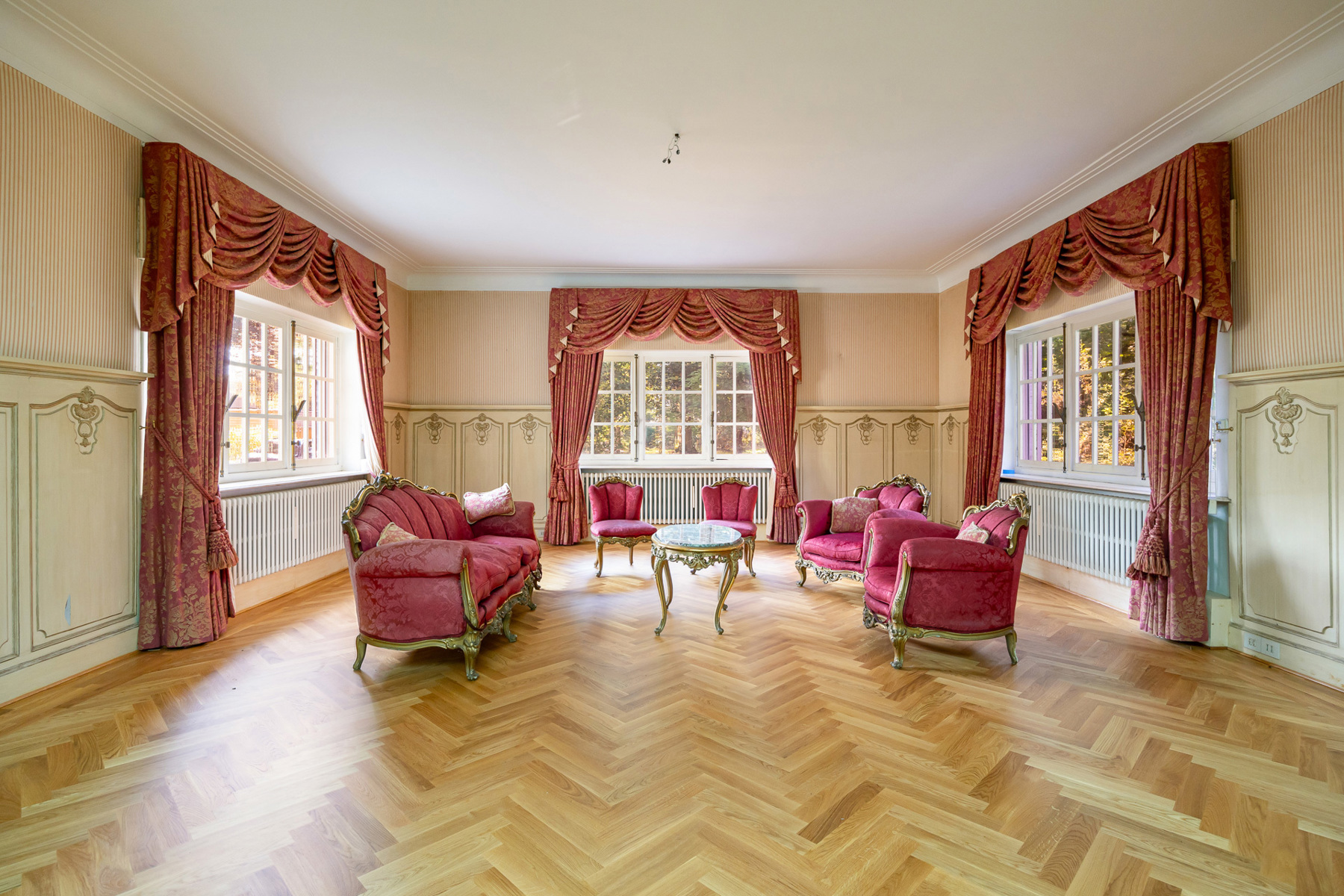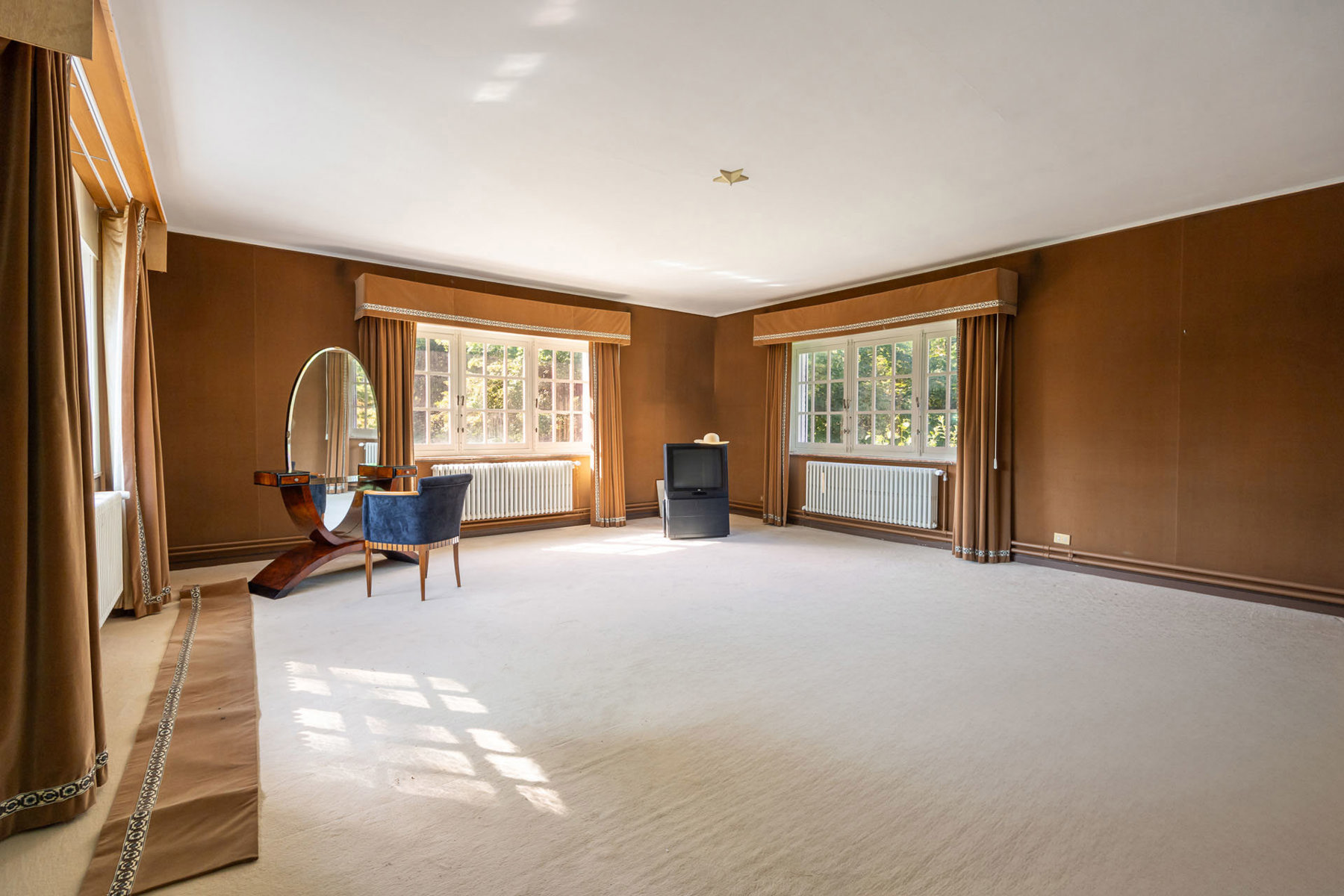 * Tal van karaktervolle elementen: parketvloeren, marmeren vloeren en raamtabletten, originele schouwen, lambriseringen.