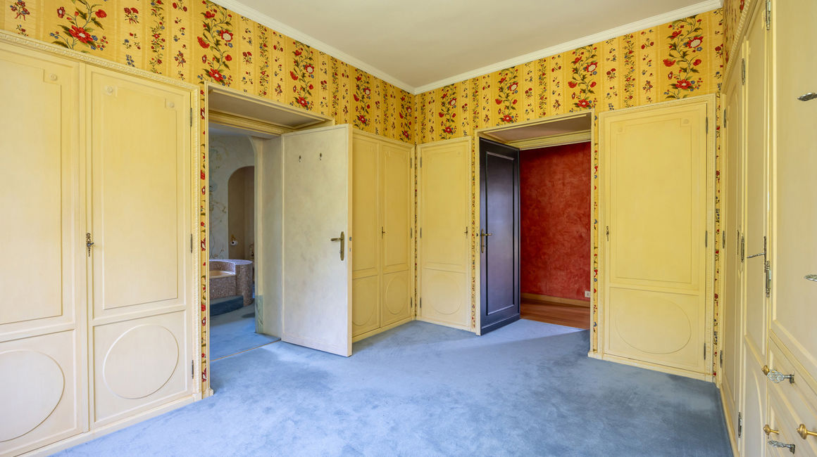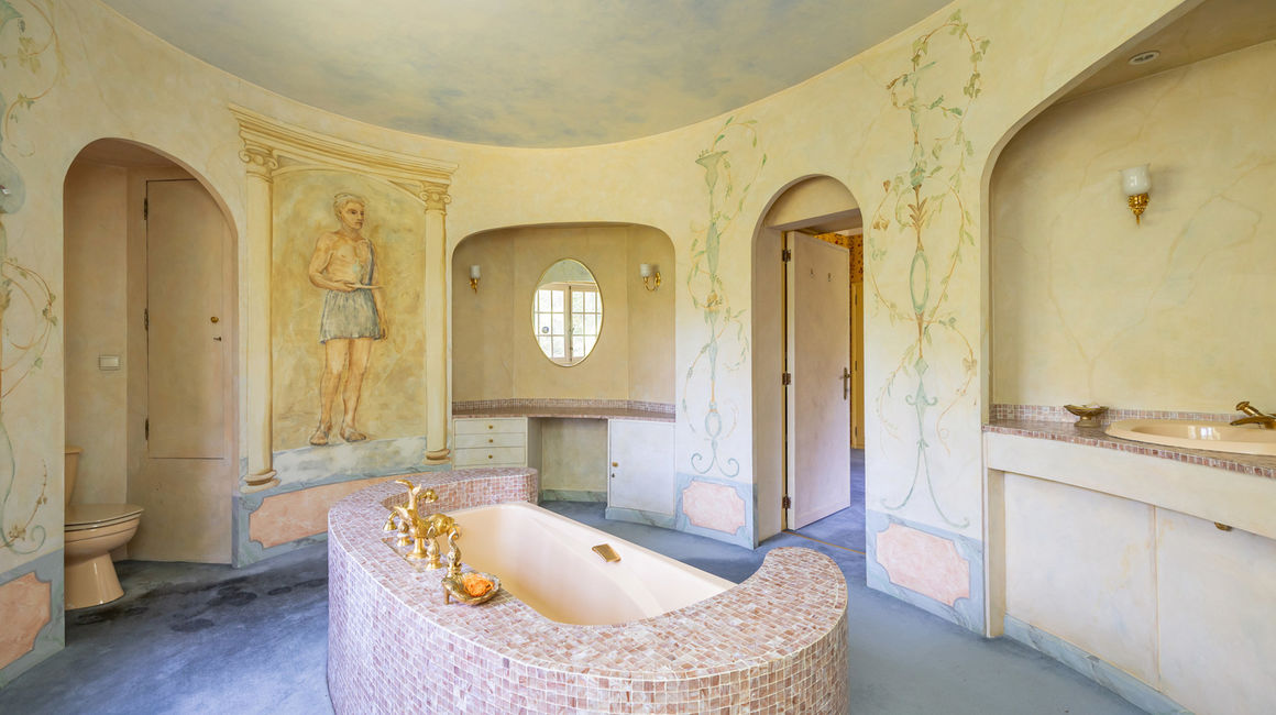 MASTERSUITE met salon is volledig ingericht in stijl Alain Delon, ensuite DRESSINGKAMER en ingerichte BADKAMER in mozaïek met gouden kranen, fresco’s, dubbele lavabo en boudoire, telkens in een nis met appliques.