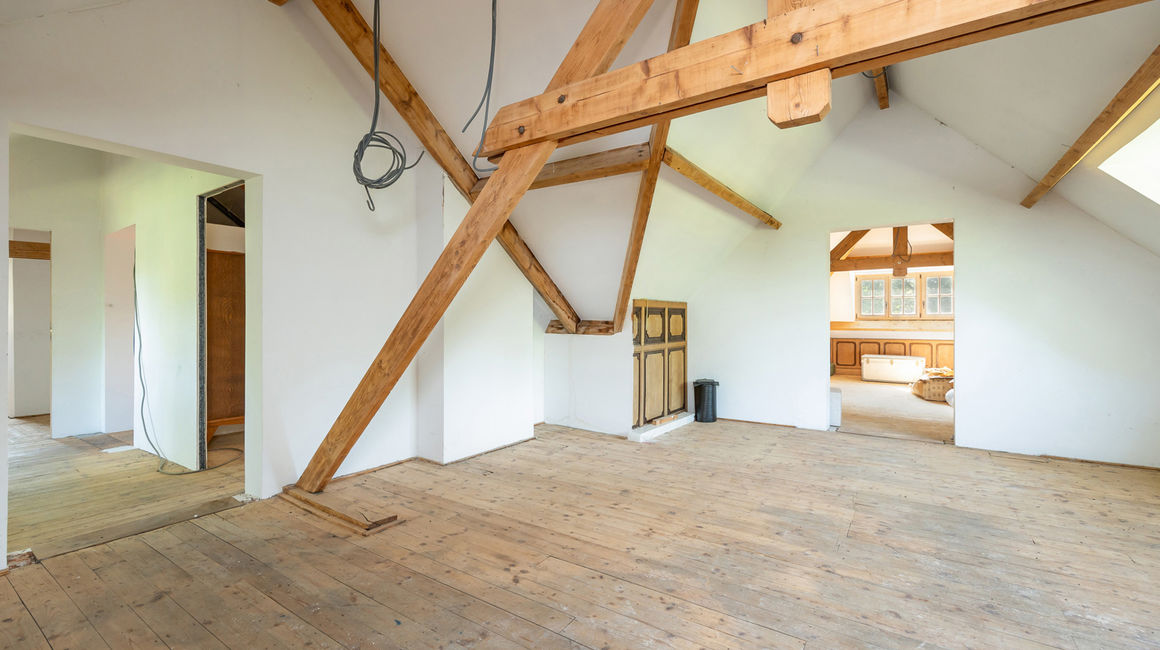 * In de zolder ligt een aansluiting voor verwarming en bekabeling voor elektrische spots evenals lambrisering.