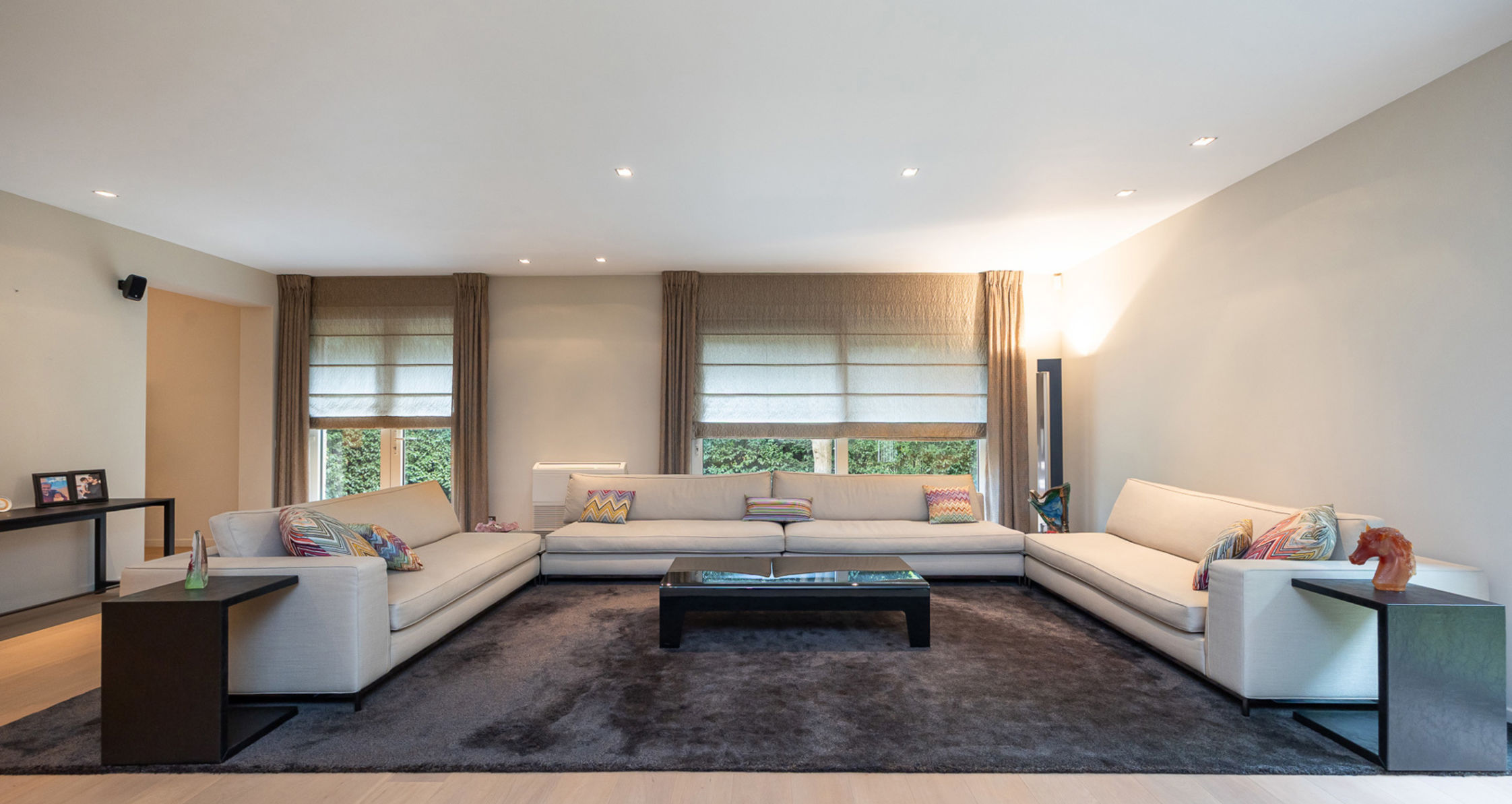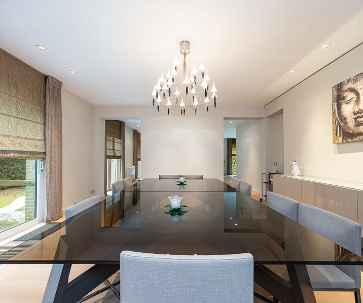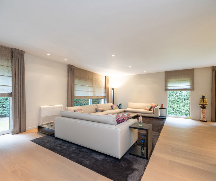 Via de ruime inkomhal met gastentoilet en vestiarekasten betreedt men de riante en lichtrijke leefruimte op parket. Deze is onderverdeeld in zithoek, salon en een eetkamer. Aansluitend aan deze leefruimte bevindt zich de geïnstalleerde aparte leefkeuken met ontbijthoek, een kookeiland, opbergkasten en alle toestellen. Vooraan is er een aparte bureauruimte/tv-kamer/logeerkamer op parket.