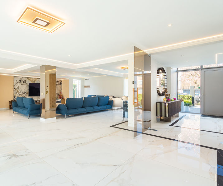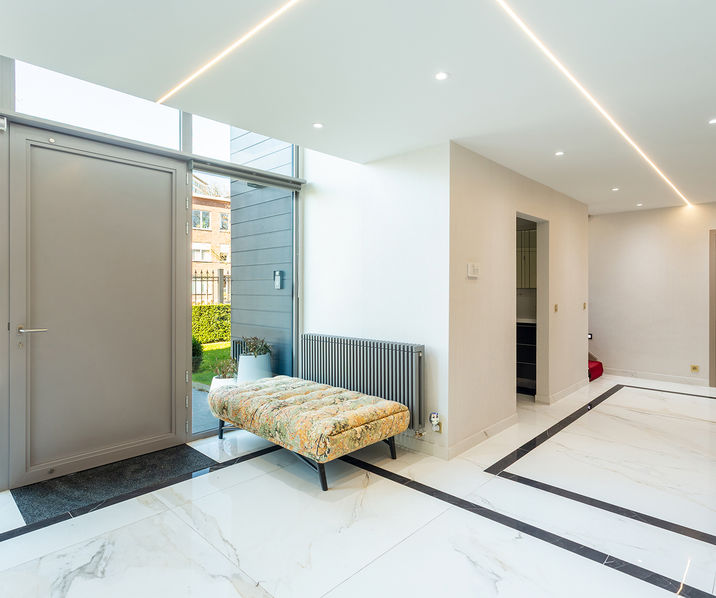 U komt binnen in de lichtrijke INKOMHAL (ca. 4m x 4m) met apart gastentoilet en vestiaire (ca. 3m45 x 3m).