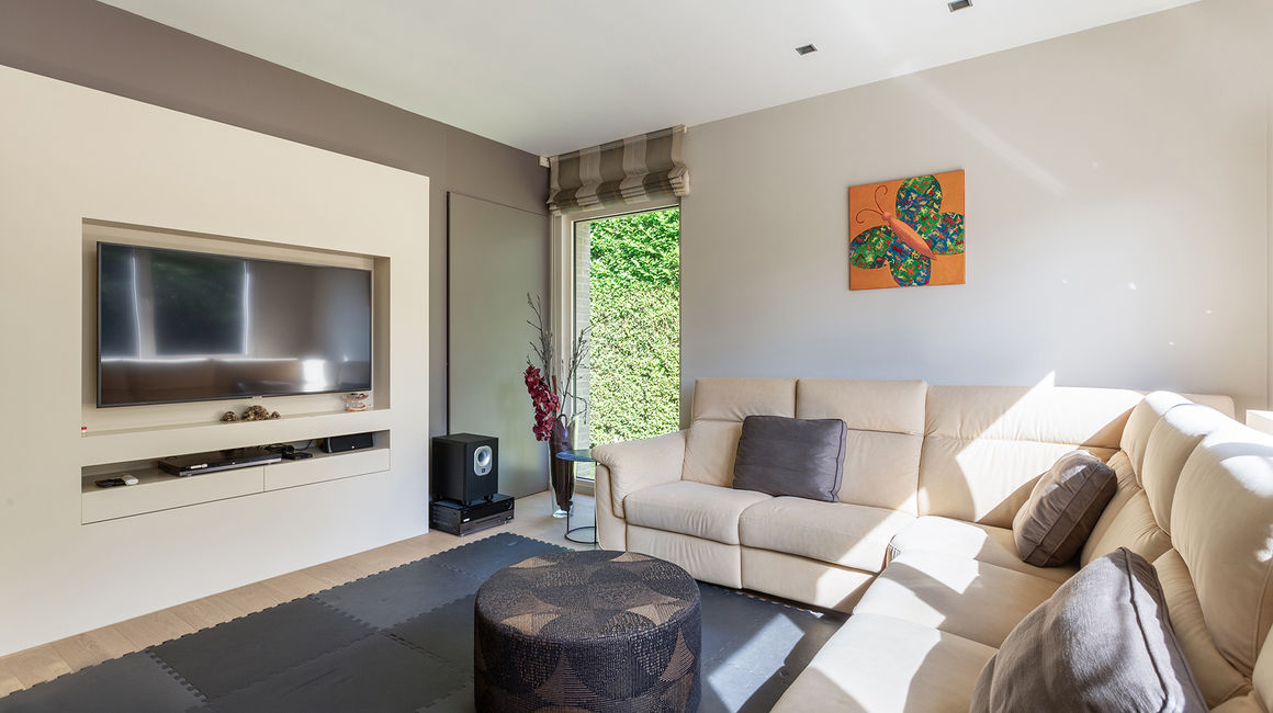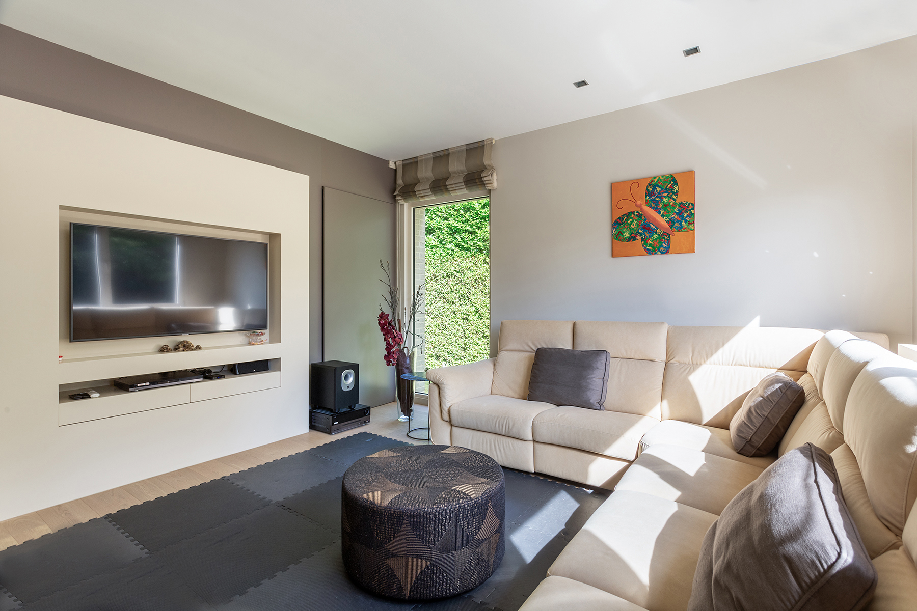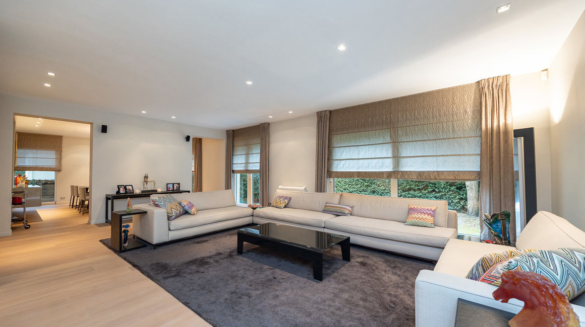 Via de ruime inkomhal met gastentoilet en vestiarekasten betreedt men de riante en lichtrijke leefruimte op parket. Deze is onderverdeeld in zithoek, salon en een eetkamer. Aansluitend aan deze leefruimte bevindt zich de geïnstalleerde aparte leefkeuken met ontbijthoek, een kookeiland, opbergkasten en alle toestellen. Vooraan is er een aparte bureauruimte/tv-kamer/logeerkamer op parket.