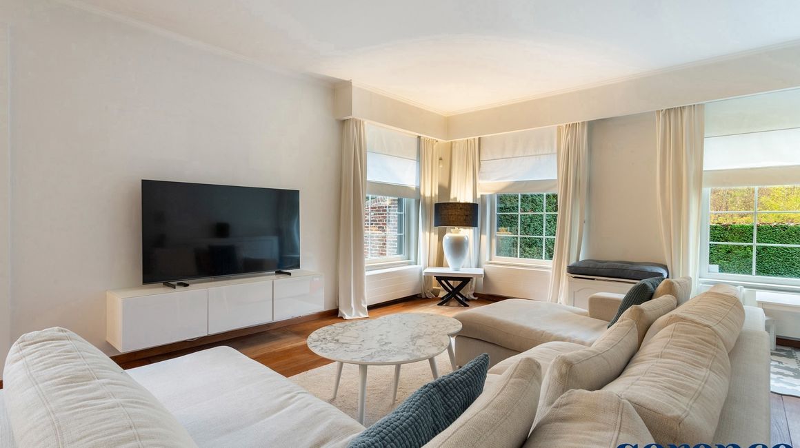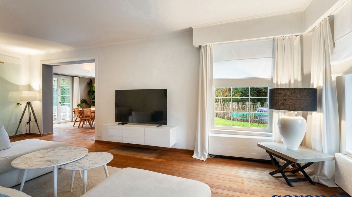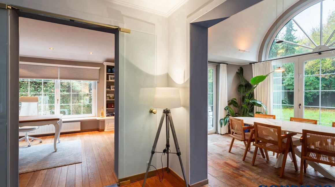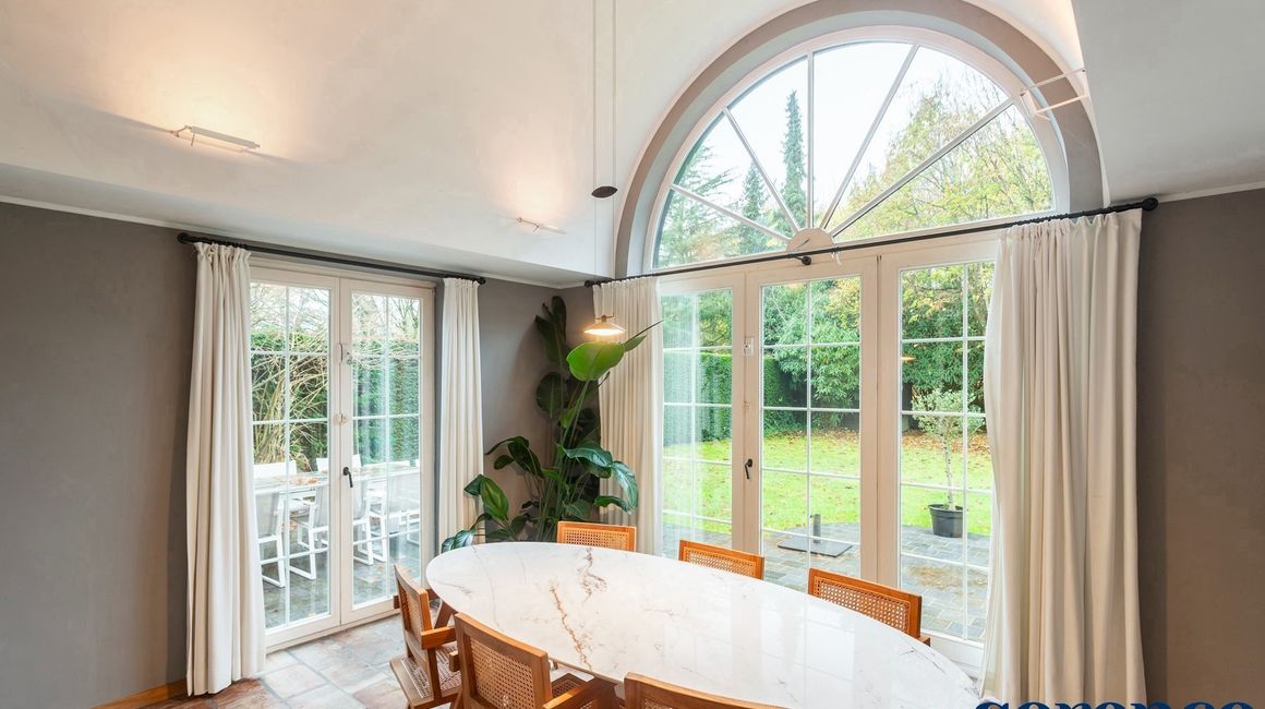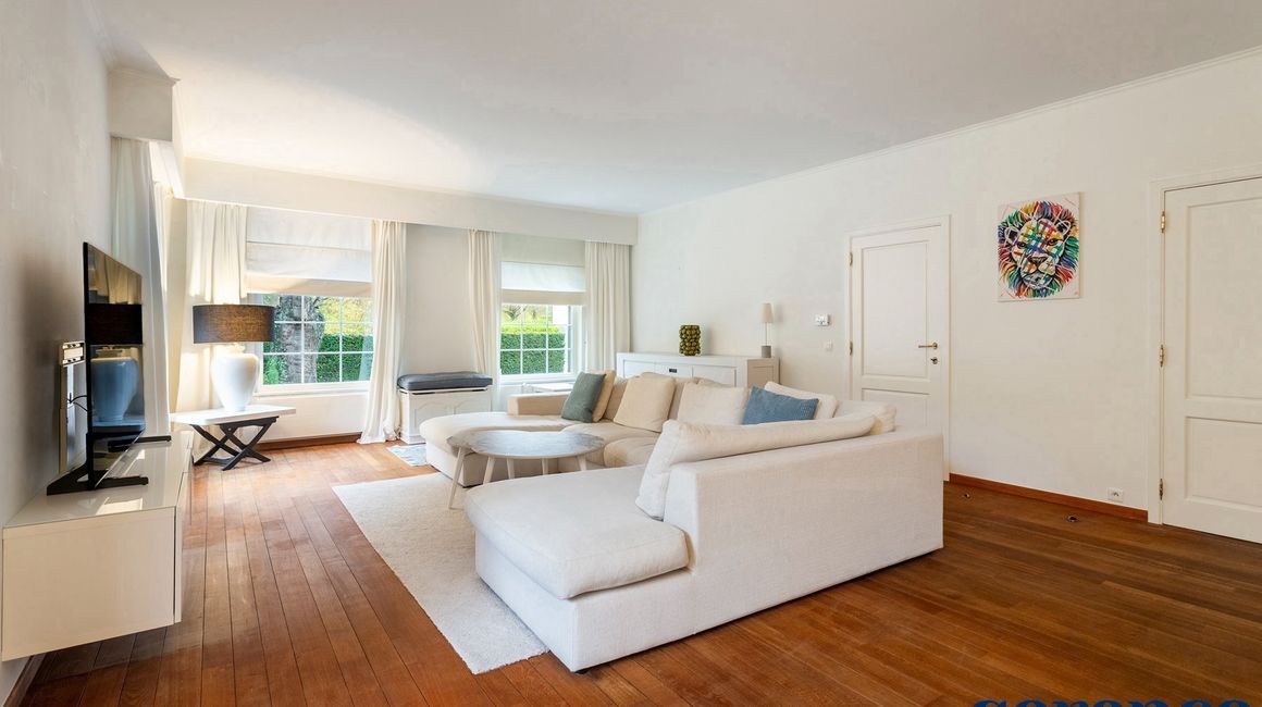 Vervolgens komt u in de ruime LIVING van ca. 42m² op parketvloer en de EETKAMER van ca. 35m², op een natuurstenen vloer.