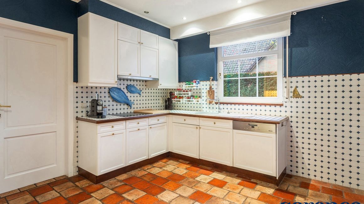 De KEUKEN van ca. 15m², beschikt over alle toestellen (koelkast/diepvries, oven, keramische kookplaat, ingebouwde dampkap, ...) met hiernaast een ruime berging ca. 7,5m².