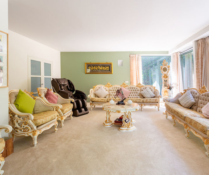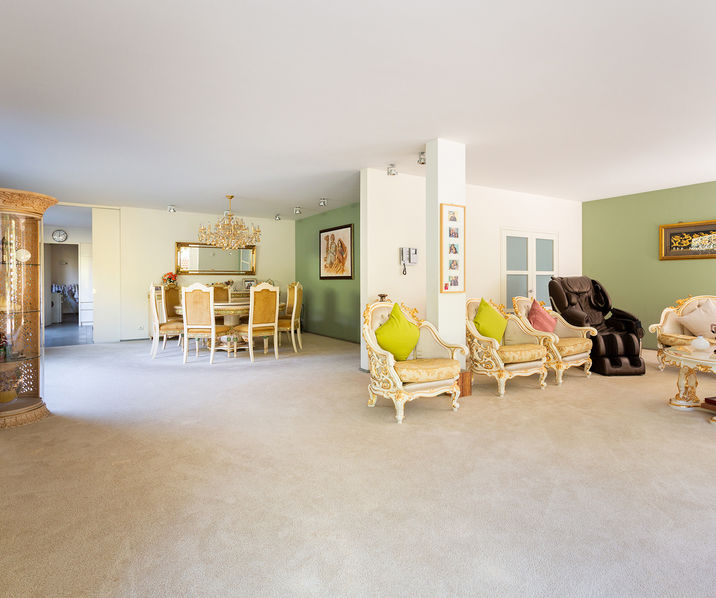 De ruime INKOMHAL geeft toegang tot de lichtrijke LIVING met EETRUIMTE ca. 25mē en ZITRUIMTE ca. 54mē. Ensuite bevindt zich de volledig ingerichte KEUKEN ca. 25mē, met 5-pit gasplaat, hete luchtoven, afwasmachine en een grote Amerikaanse koelkast. De BIJKEUKEN ca. 13mē is compleet voorzien van ingemaakte kasten.